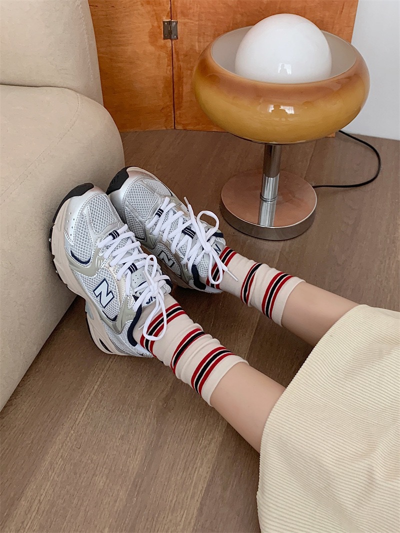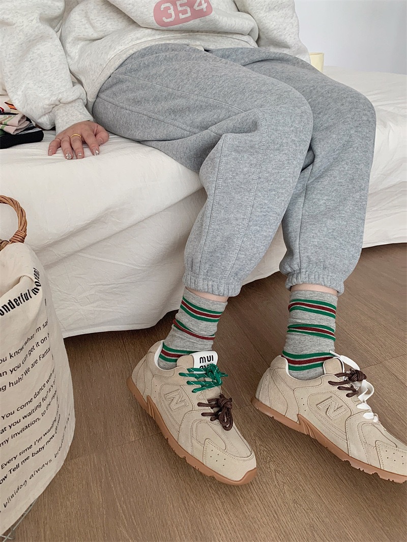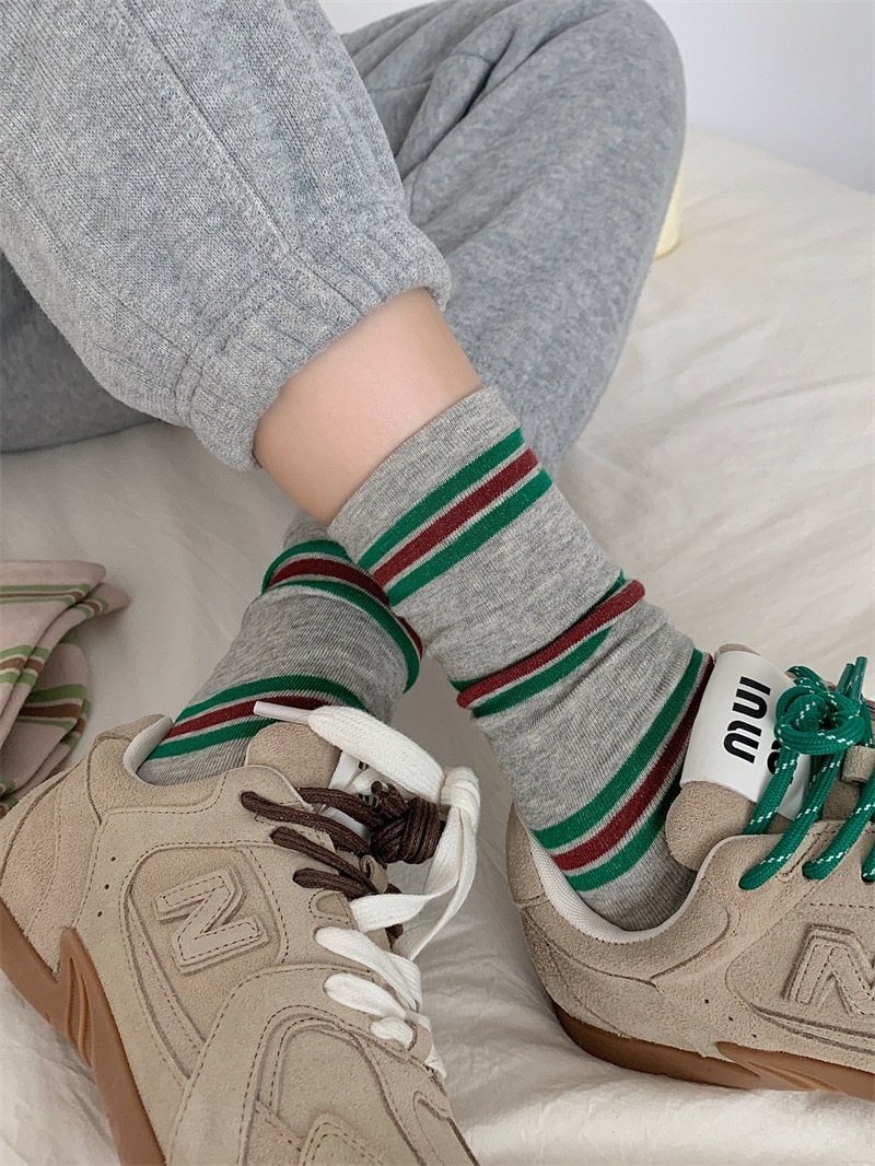 miu スタイルのキャットウォーク グレー カーフ ソックス レディース イン トレンド 韓国スタイル オールシーズン 縦ストライプ 無地 ミッドカーフソックス