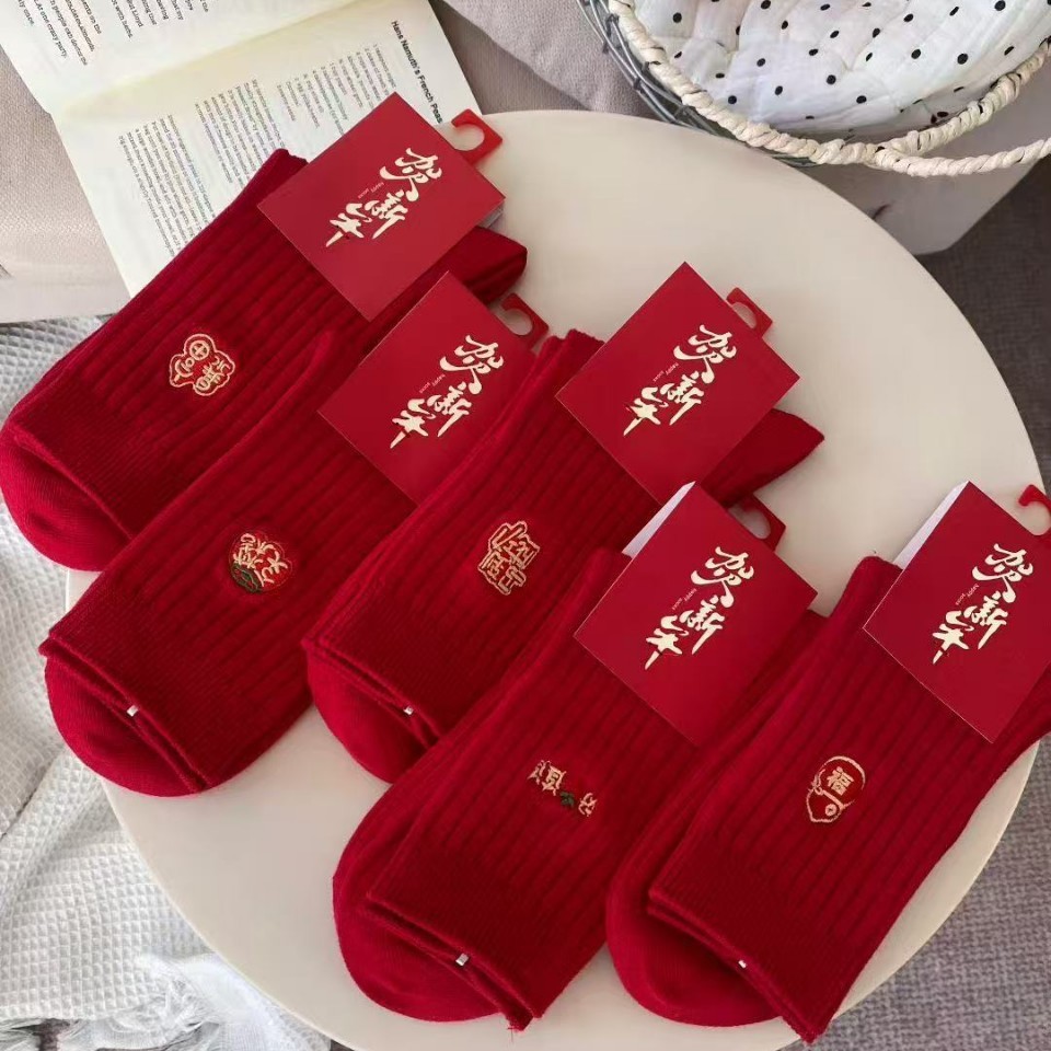 秋冬新款成人袜冬季袜刺绣马年红色春节本命的休闲中筒袜成人男女
