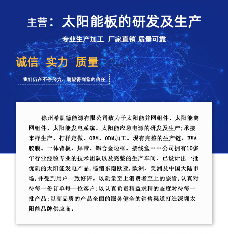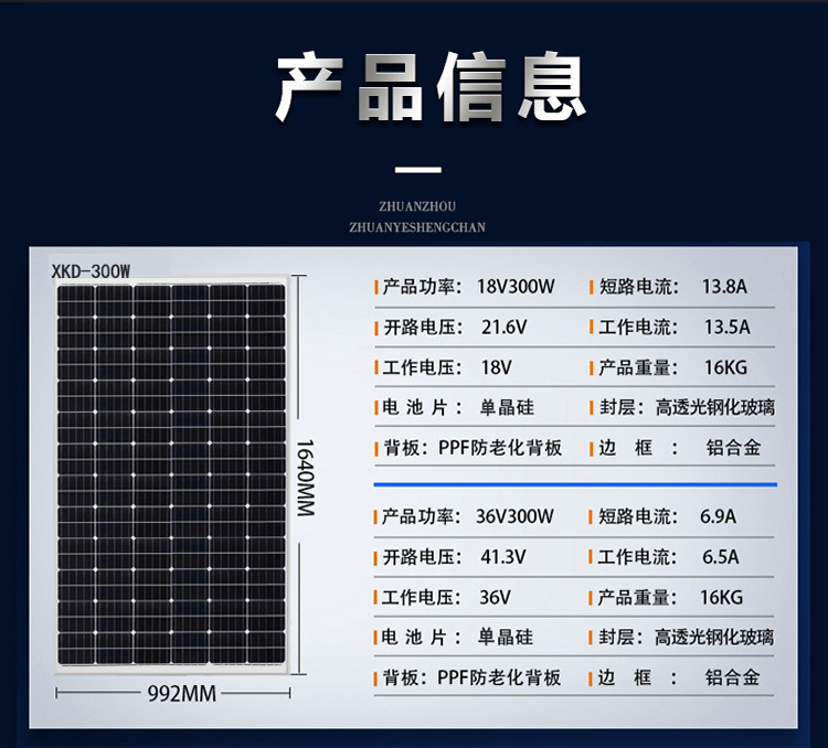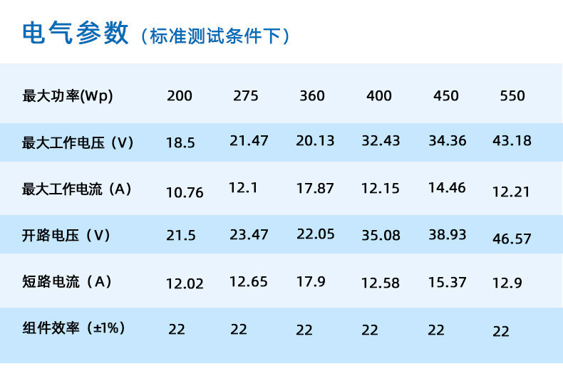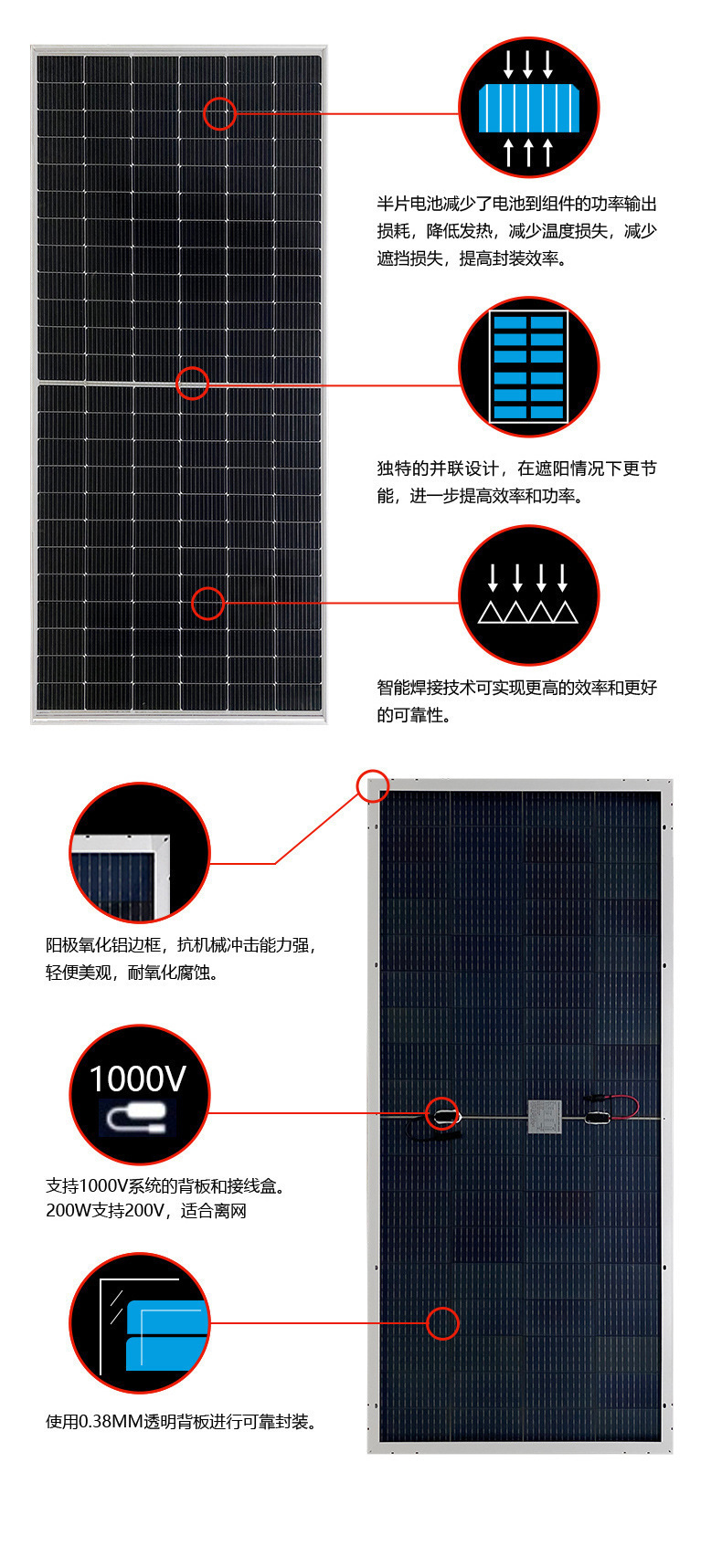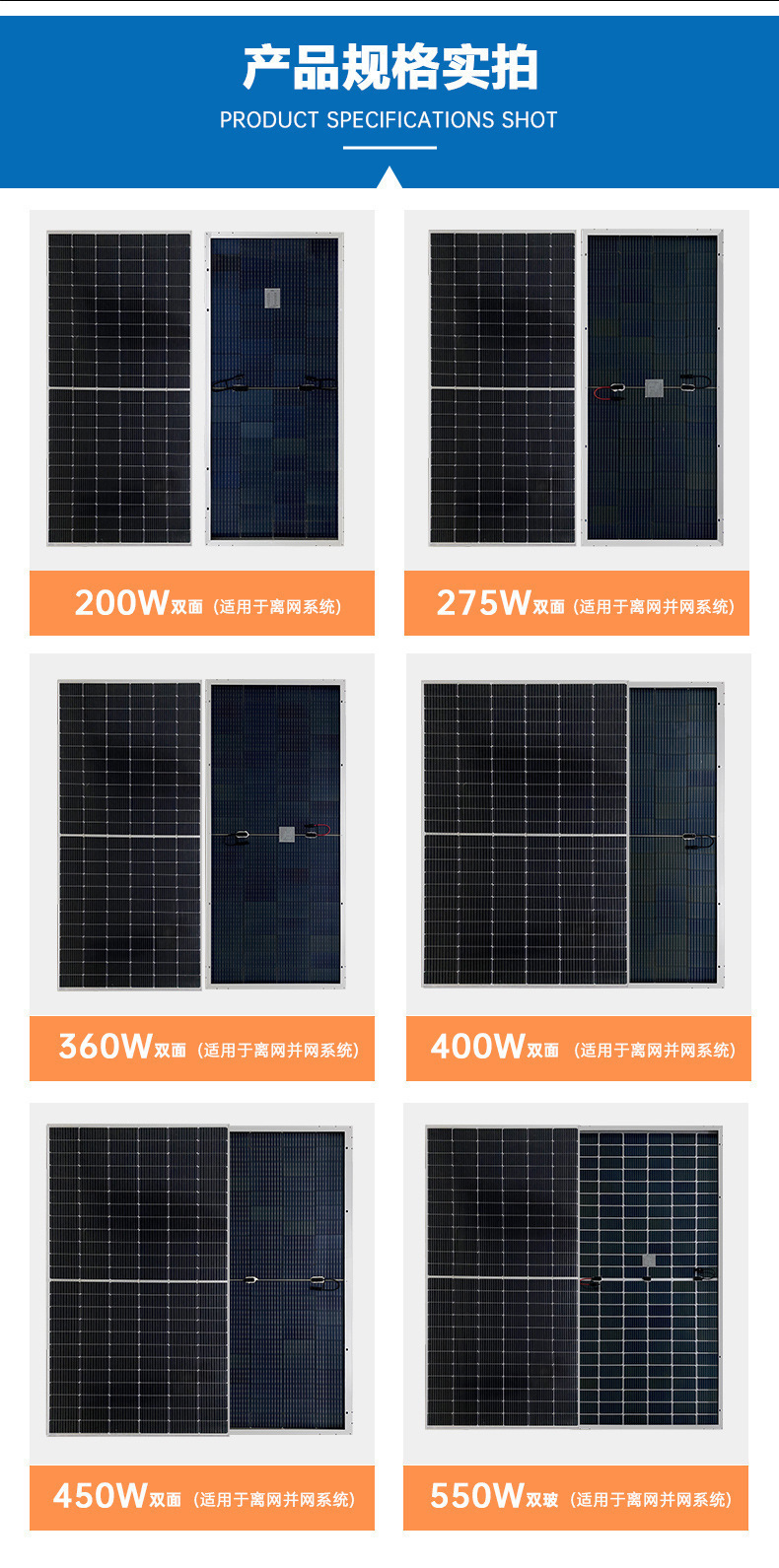 规格型号 单晶12V30W 350*630mm,单晶 12V50W 530*670mm,单晶 12v 60W 590*670mm,单晶12V 80W 830*550mm,单晶12V100W 1200*540mm,单晶12V100W 1200*550mm,单晶12V100W 910*670mm,单晶12V100W 1010*540mm,单晶12V110W1200*580mm,单晶12V120W 1020*670mm,单晶12V135W1200*670mm,单晶12V150W 1320*670mm,单晶12V180W1480*670mm,单晶12V190W1580*670mm,单晶12V200W 1580*810mm,单晶24V200W 1580*810mm,单晶12V200W 1200*880mm,单晶24V200W 1200*880mm,单晶12V200W 1640*670mm,单晶12V220W 1305*875mm,单晶12V250W 1380*990mm,单晶12V300W 1640*990mm,单晶24V300W 1640*990mm,单晶12V300W 1705*880mm,单晶24V300W 1705*880mm,单晶24V350W1960*992mm,MC4防水插头,18V200W单玻双面1580*710mm,300M10-4/18双面1722*776mm,400M12-4/18双面1960*889mm,450M10-6/18双面1722*1134mm,500M10-6/20双面1910*1134mm,585M10-6/24双面2278*1134mm,单晶12V200W 1150*990mm