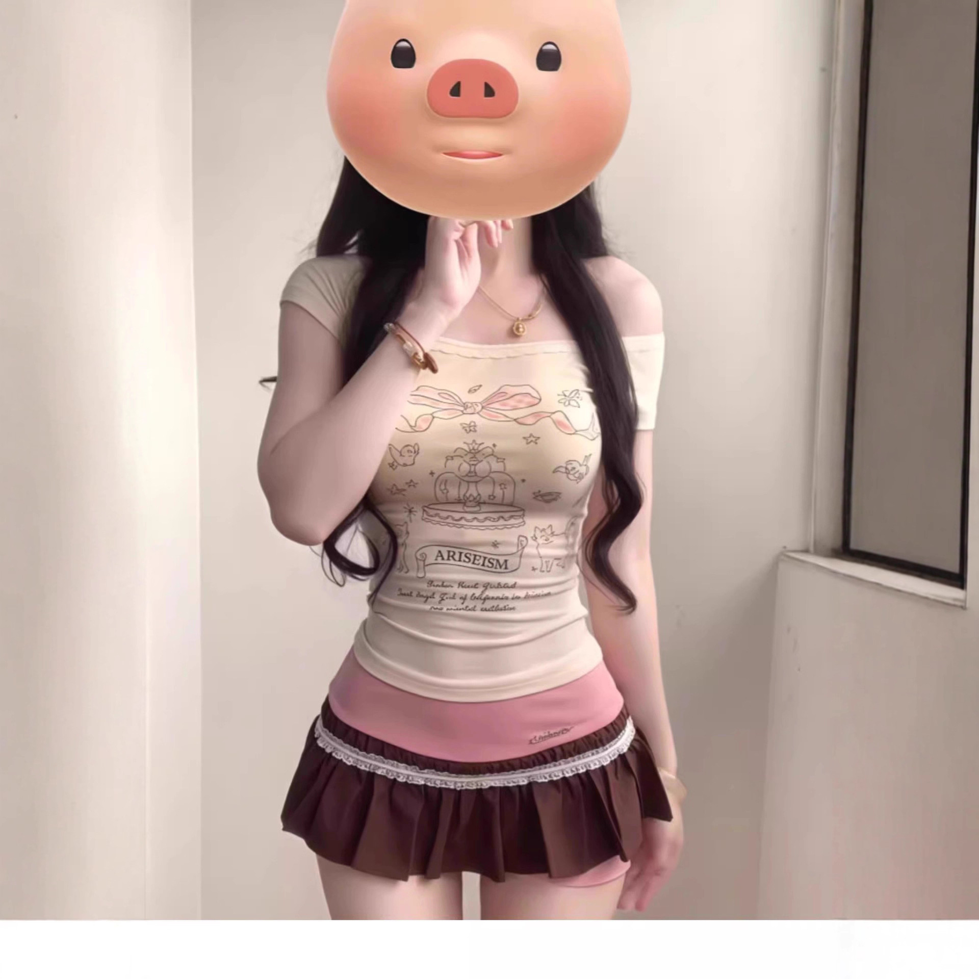 辣妹蕾丝一字领露肩短袖T恤女纯欲卡通印花修身显瘦短款紧身上衣