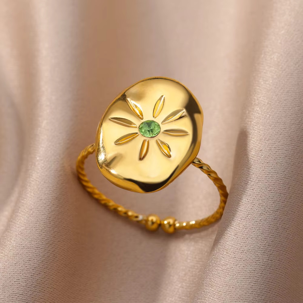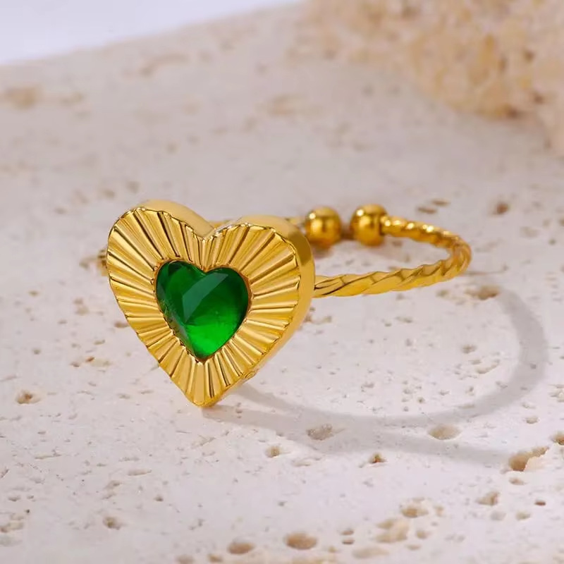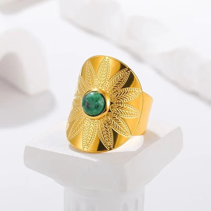 欧美跨境复古祖母绿天然石开口不锈钢戒指轻奢高级感锆石指环代发