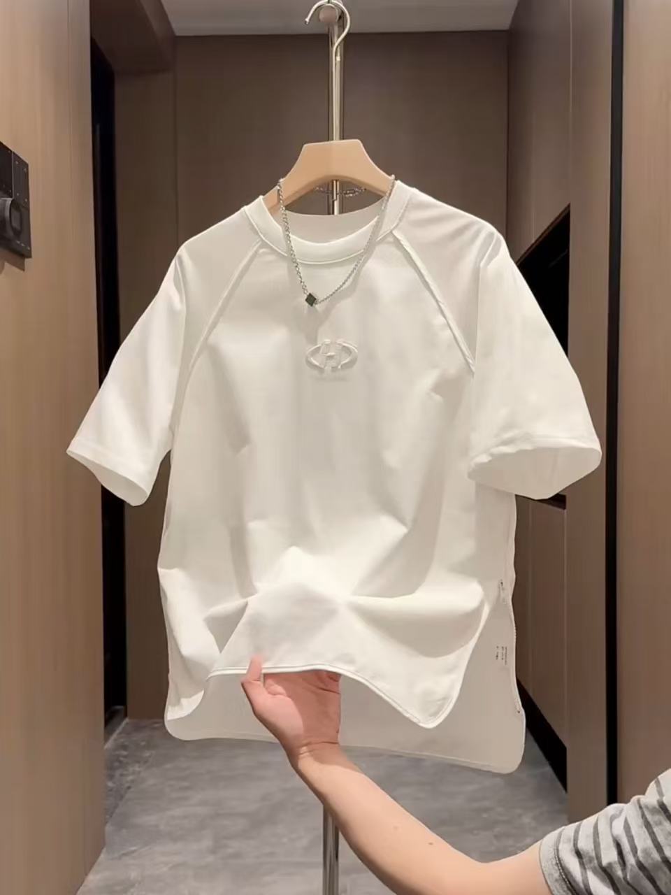 夏ジッパー刺繍ラウンドネック半袖 Tシャツメンズトレンディな多用途ソリッドカラートップカップルカジュアルインルーズ半袖