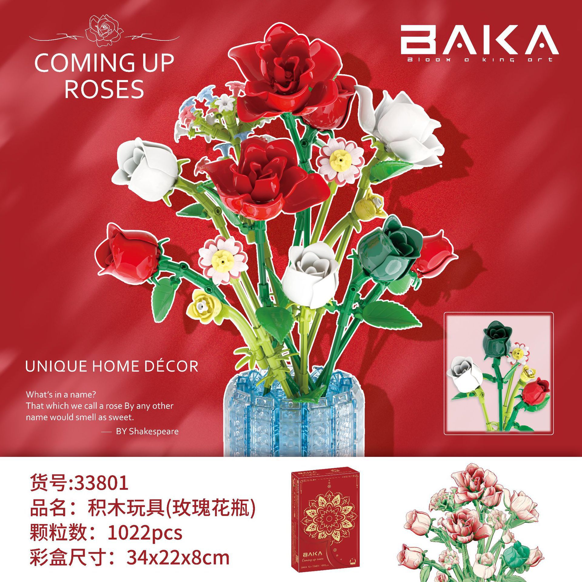 Baka ビルディングブロックフラワーシリーズ 33801-33804 チューリップローズ鉢植えパズル組み立て小粒子ビルディングブロック
