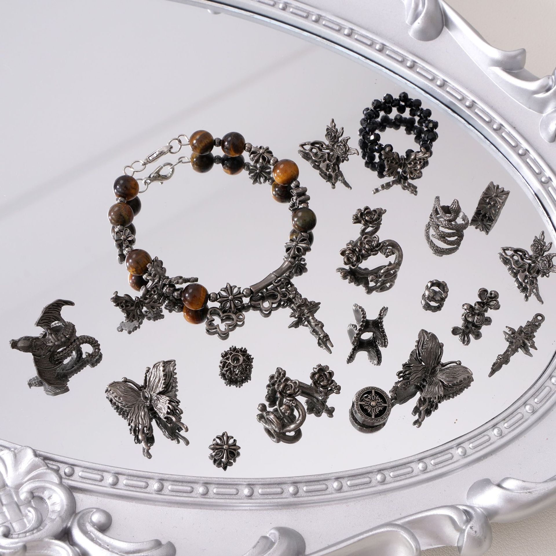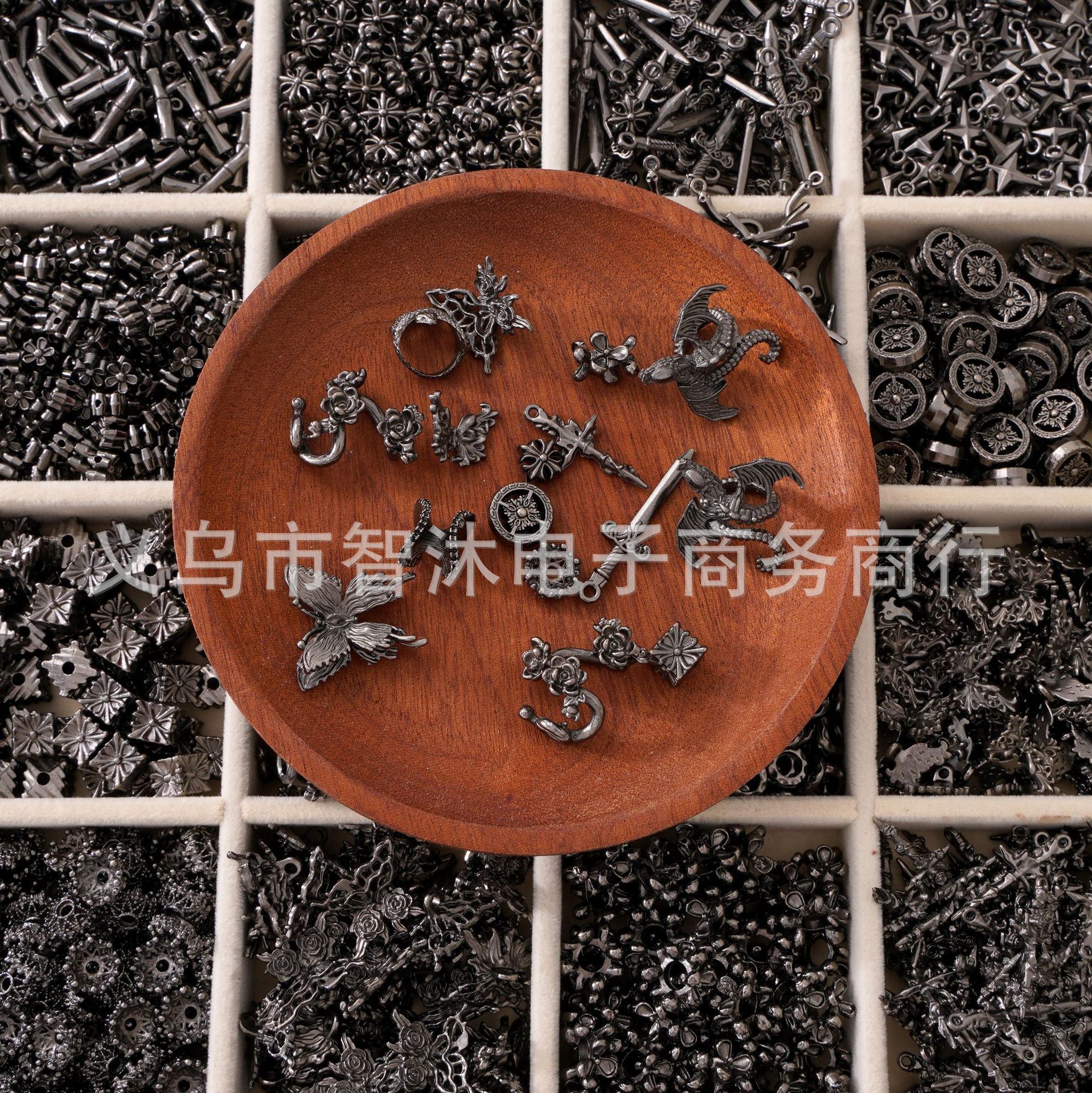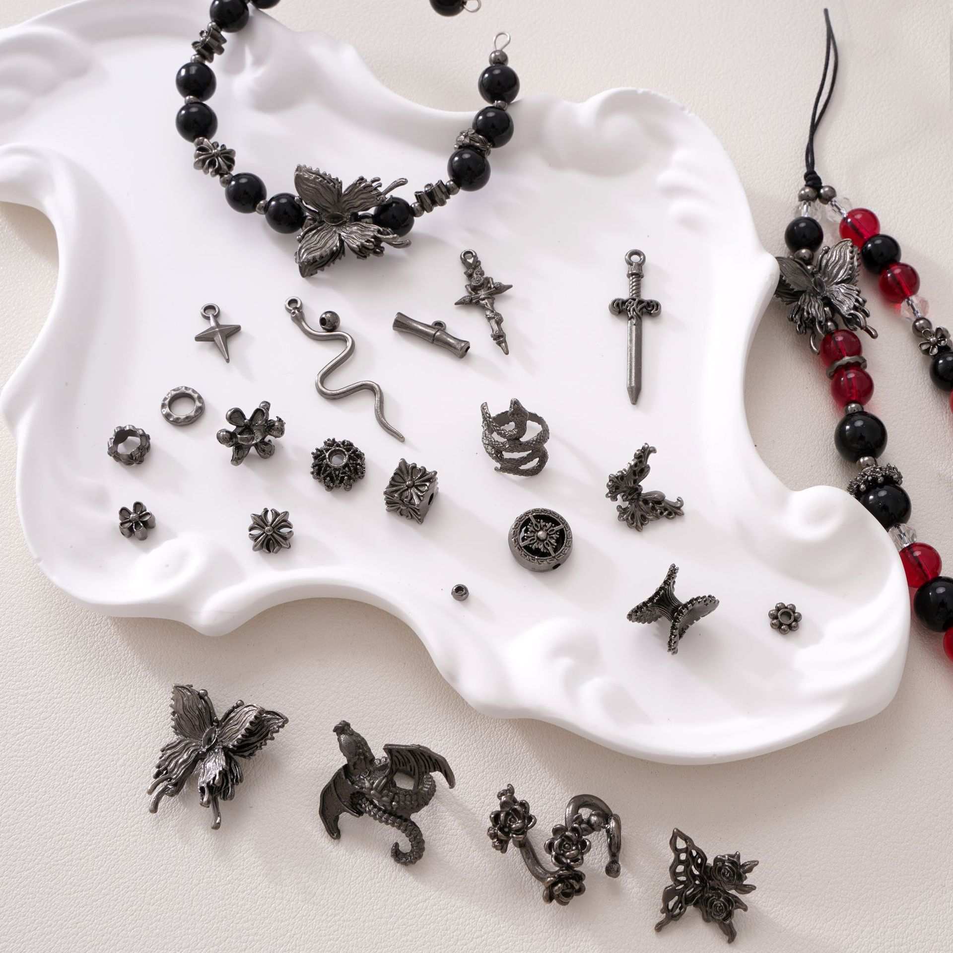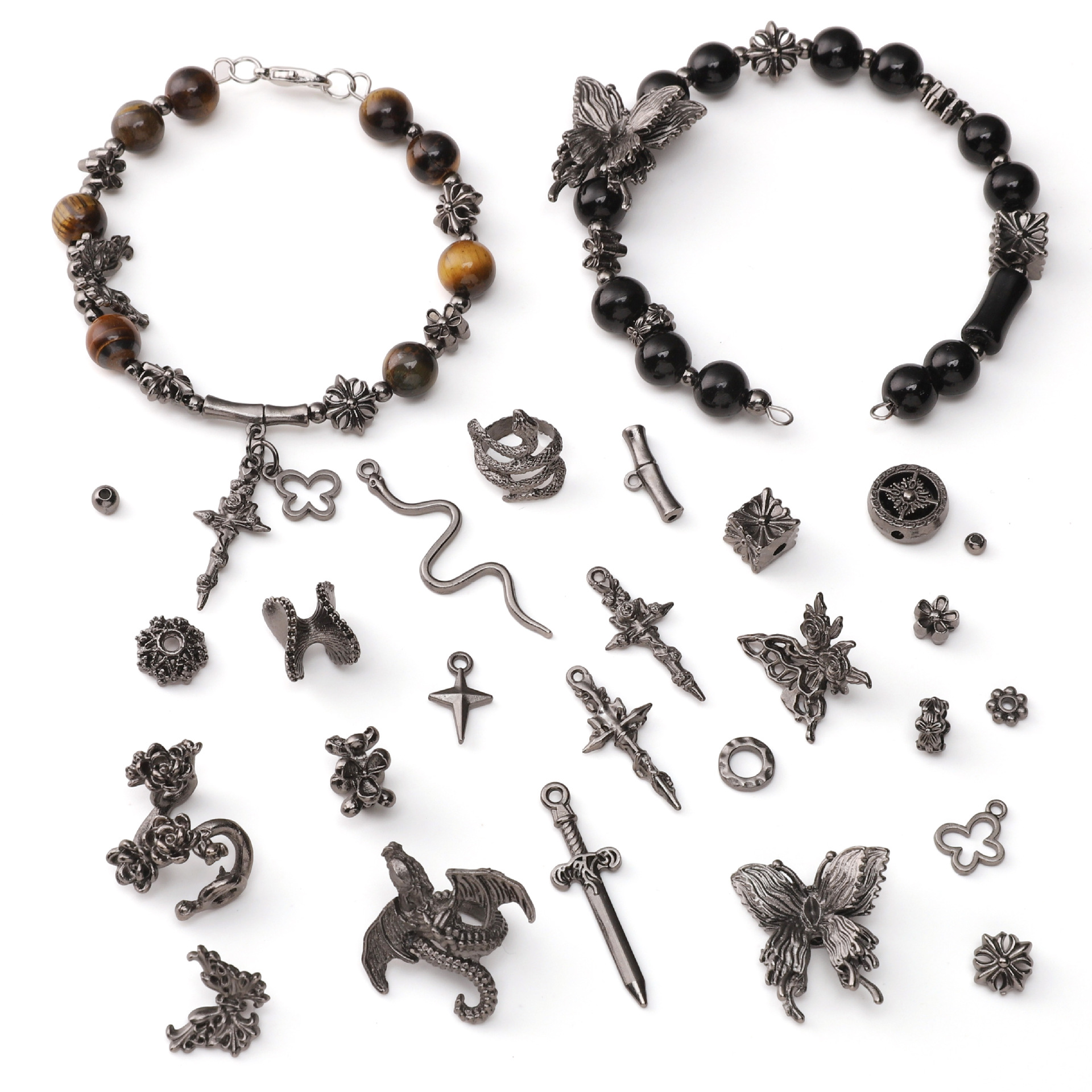 1# 花纹四方 8mm 孔径约2mm 枪黑 5个/包,3# 简笔蝶 11x8mm 孔径约1.5mm 枪黑 30个/包,4# 玫瑰蝴蝶 16x19mm 孔径约2mm 枪黑 5个/包,5# 十字架 8mm 孔径约1.5mm 枪黑 10个/包,6# 星芒 9x14mm 孔径约1.5mm 枪黑 30个/包,7# 玫瑰十字 12x26mm 孔径约1.5mm 枪黑 10个/包,8# 剑 10x34mm 孔径约1.5mm 枪黑 10个/包,9# 竹节三通 15x6mm 孔径约1.5mm 枪黑 20个/包,10# 蛇 38x11mm 孔径约1.5mm 枪黑 10个/包,11# 小花 6mm 孔径约1mm 枪黑 20个/包,12# 雪花隔片 6mm 孔径约1.5mm 枪黑 50个/包,13# 圆珠 4mm 孔径约1.5mm 枪黑 50个/包,14# 圆环 8mm 孔径约4mm 枪黑 30个/包,15# 花环 7mm 孔径约4.5mm 枪黑 20个/包,16# 扁圆花纹 11mm 孔径约1.5mm 枪黑 5个/包,17# 串孔茶花 18x24mm 孔径约3.5mm 枪黑 3个/包,18# 三瓣花环 13mm 孔径约5mm 枪黑 5个/包,19# 花托 10mm 孔径约2.5mm 枪黑 10个/包,20# 小圆珠 3mm 孔径约1mm 枪黑 100个/包,21# 灵蛇 12x17mm 孔径约10mm 枪黑 5个/包,22# 飞龙 25x26mm 孔径约10mm 枪黑 3个/包,23# 双层蝴蝶 22x22mm 孔径约2.5mm 枪黑 3个/包,24# 波浪裙边 13x11mm 孔径约2mm 枪黑 5个/包