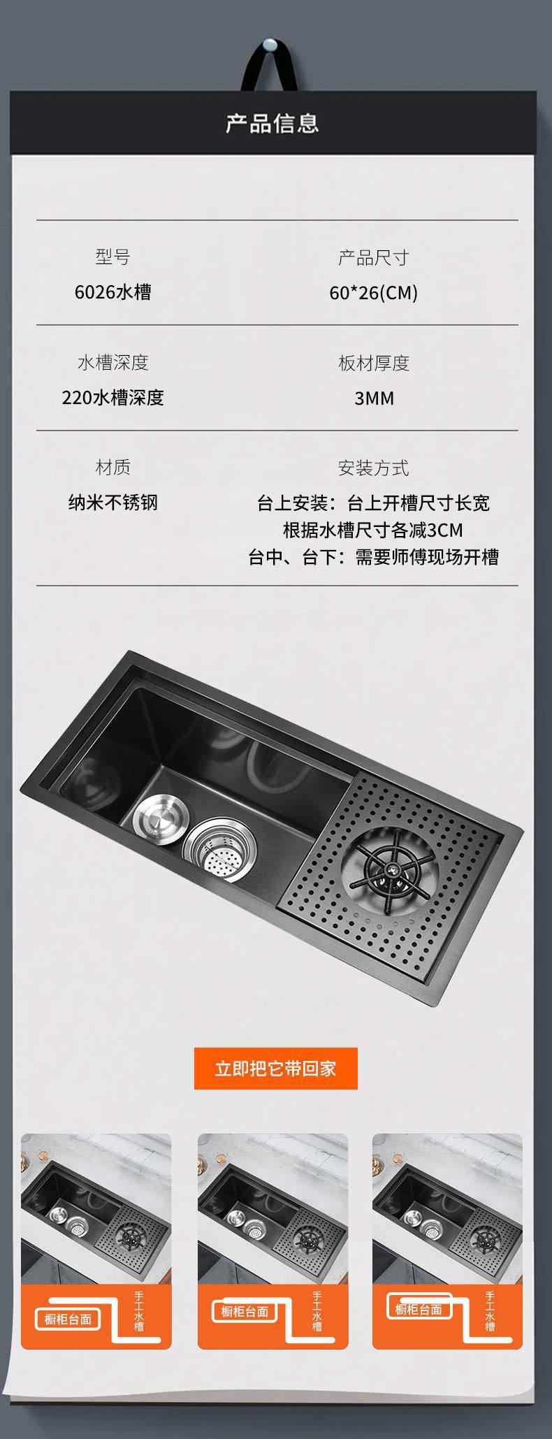 黒色ナノ304ステンレス製シンク キッチン用小型角型洗い桶 卓上型シングルシンク バーテーブル アイランドテーブル バルコニー用