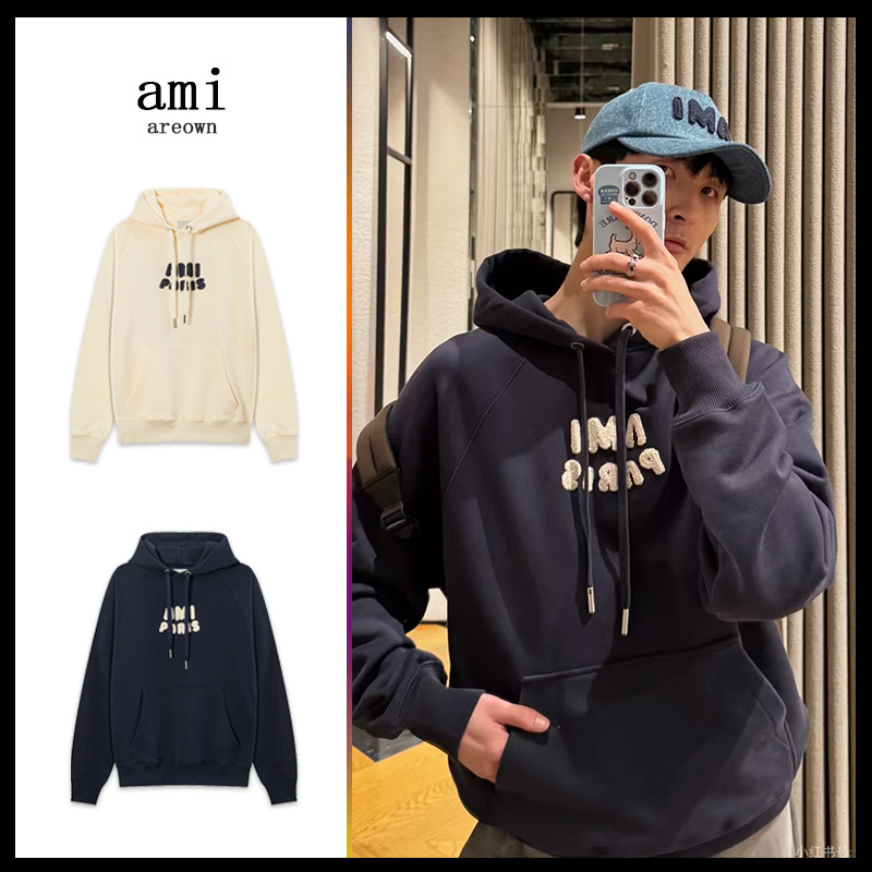 跨境ami连帽卫衣字母刺绣2025年秋冬新款宽松休闲插肩长袖帽衫