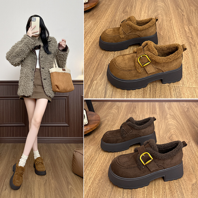 2025秋冬新款英伦风羊羔毛舒适时尚百搭加绒保暖皮带双扣软底乐福