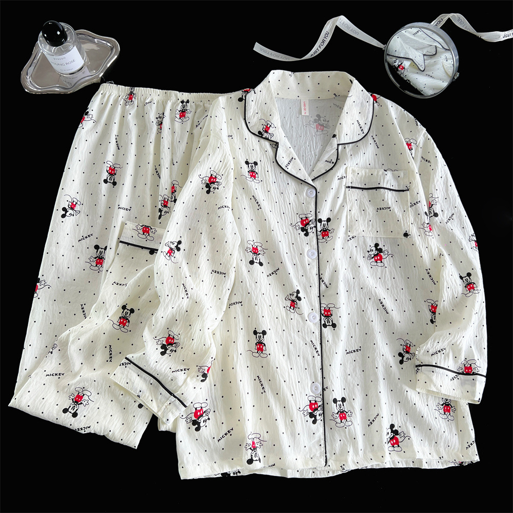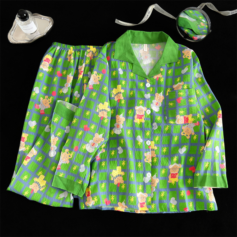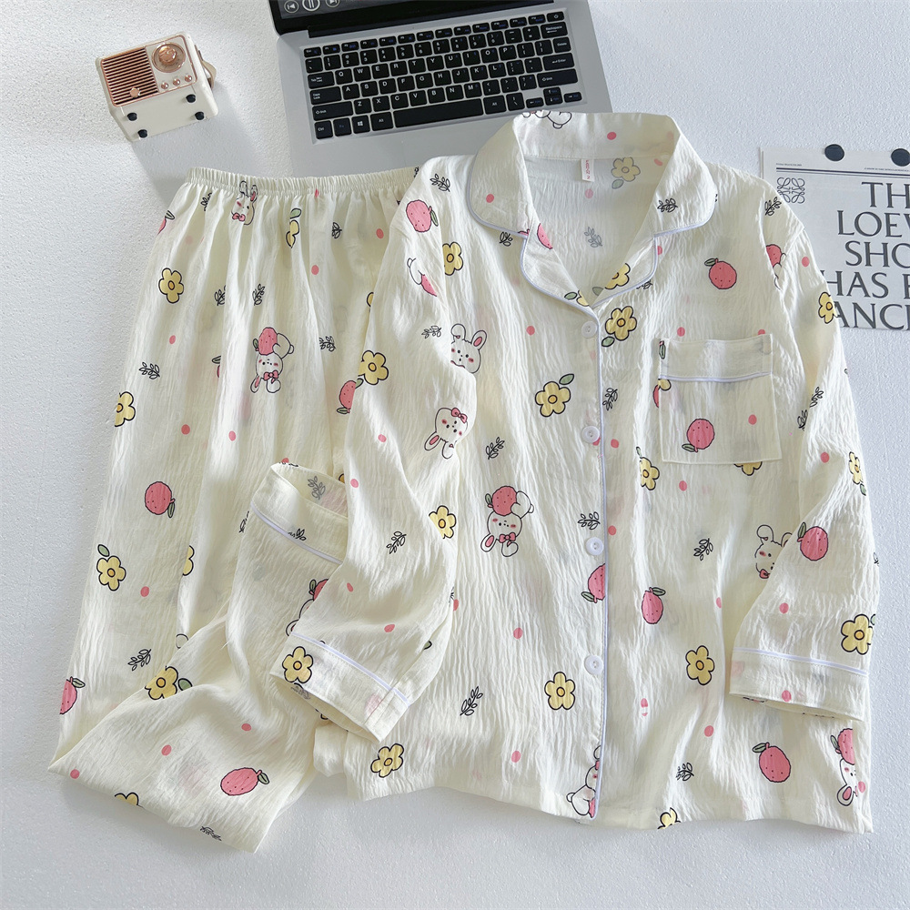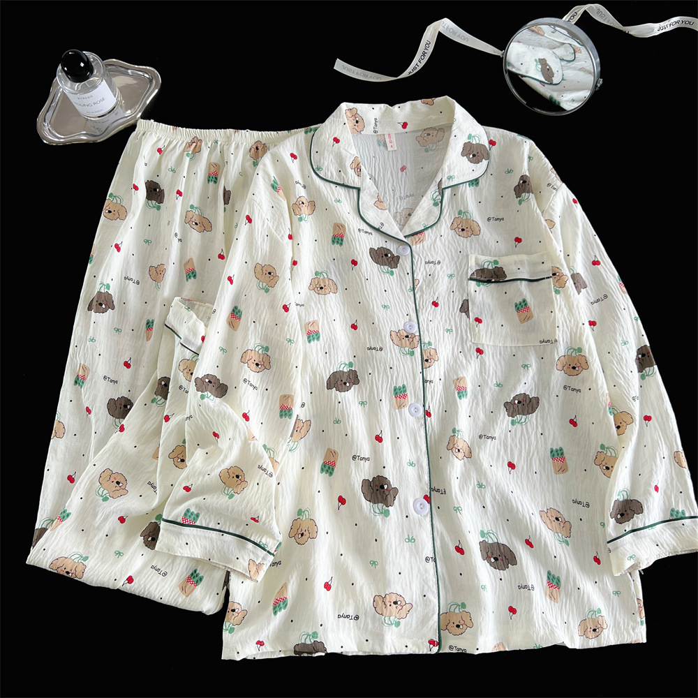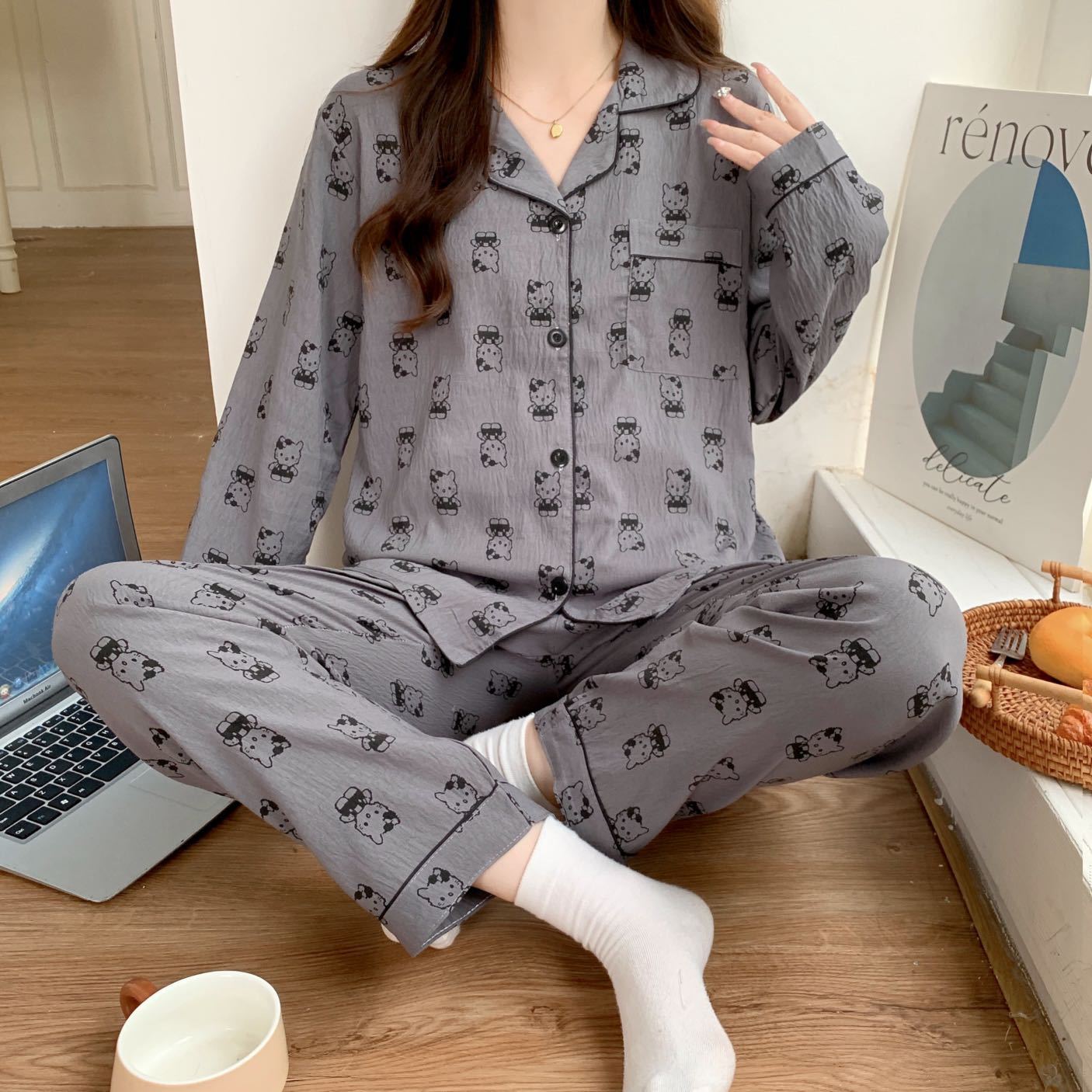 海外クロスボーダー専用パジャマ女性春と秋の雲綿の襟折りカーディガン長袖のゆったりとした甘い家庭服セット