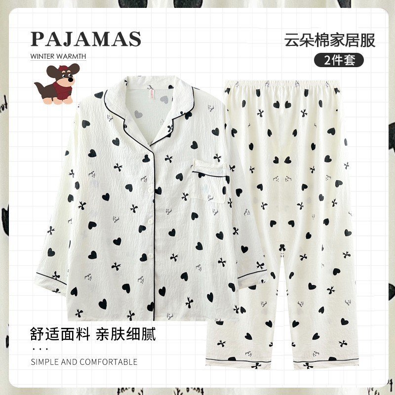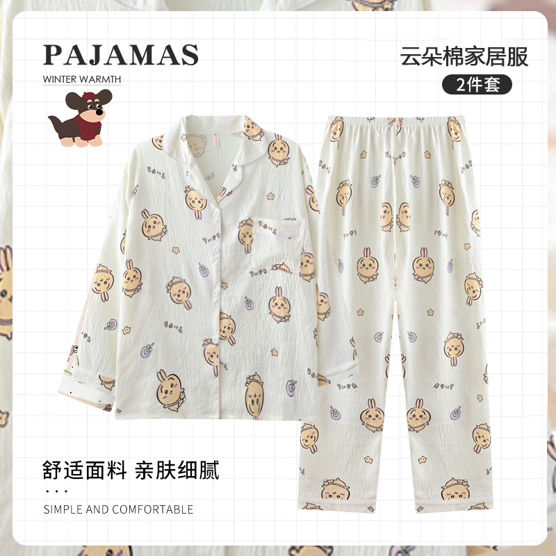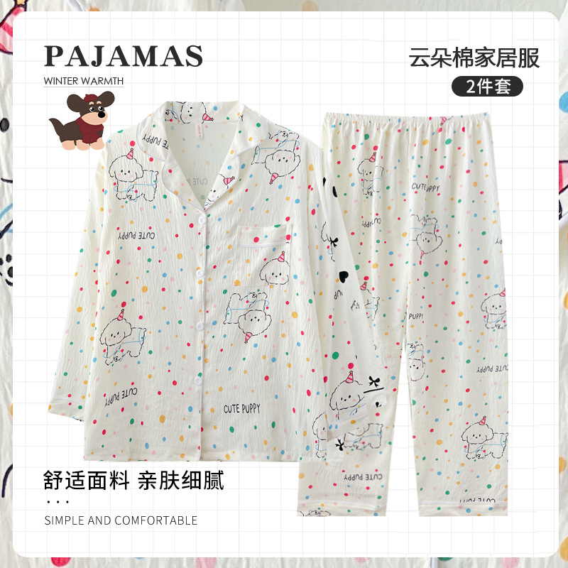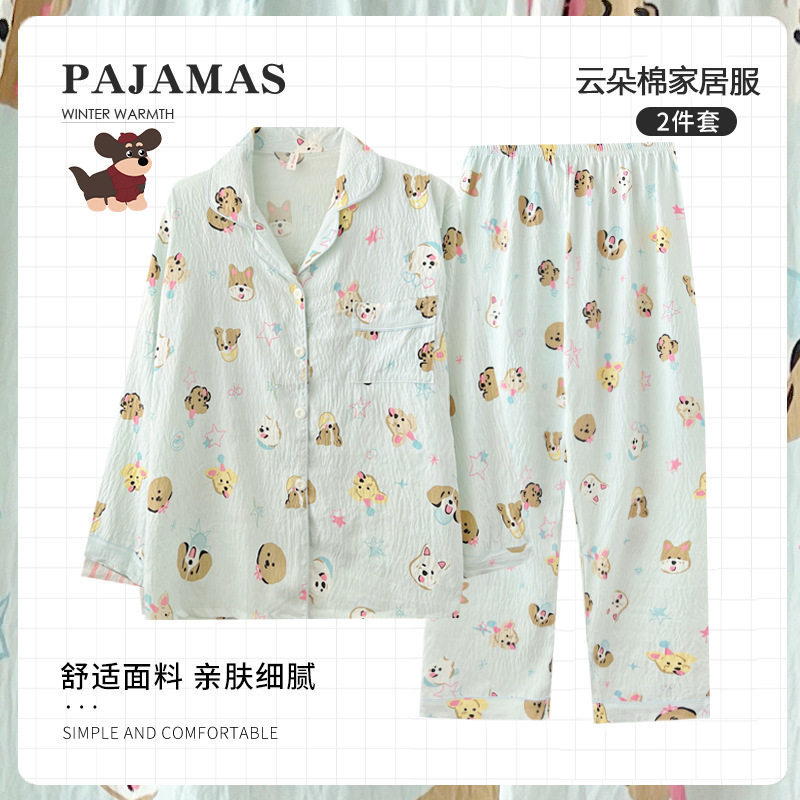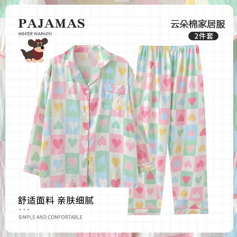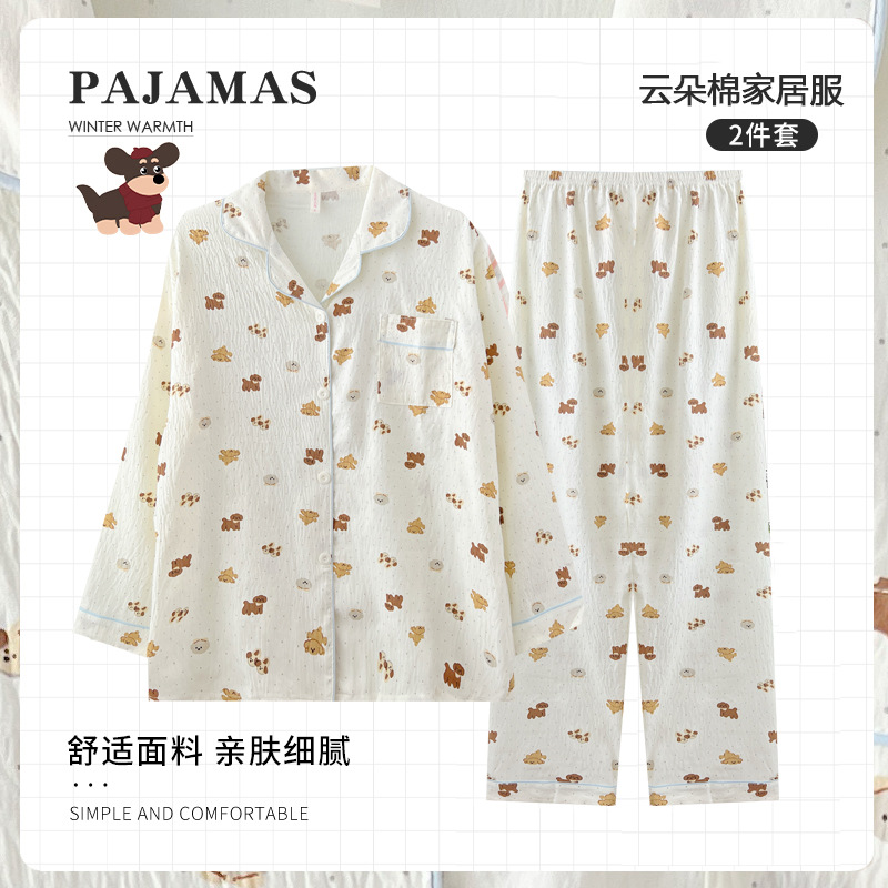 海外跨境专供睡衣女春秋云朵棉翻领开衫长袖宽松甜美家居服套装