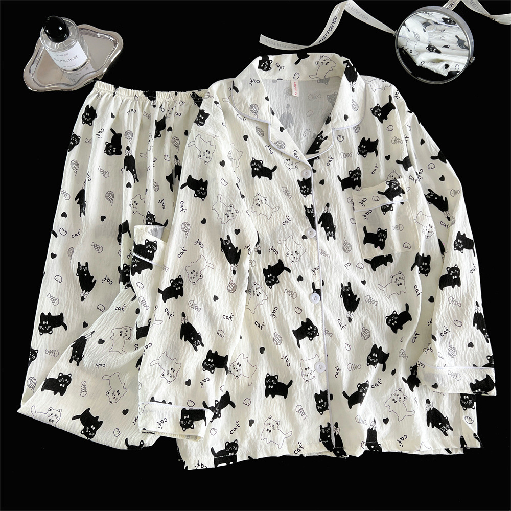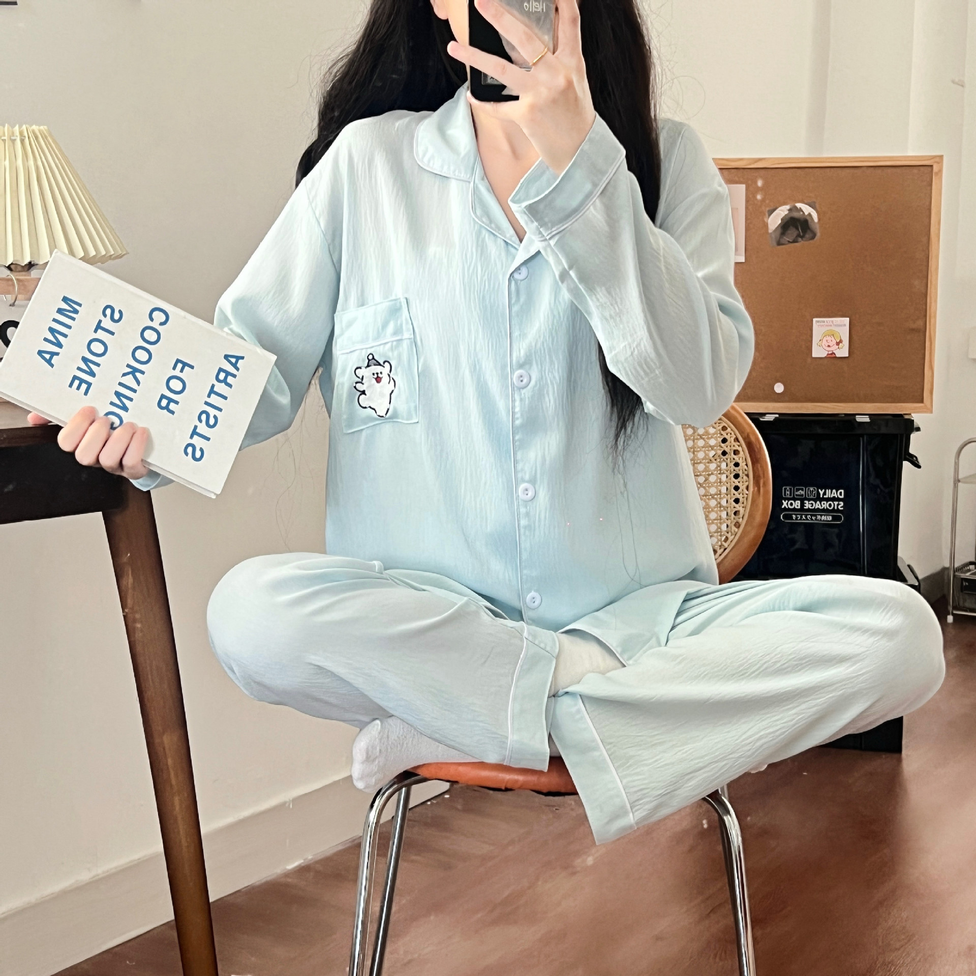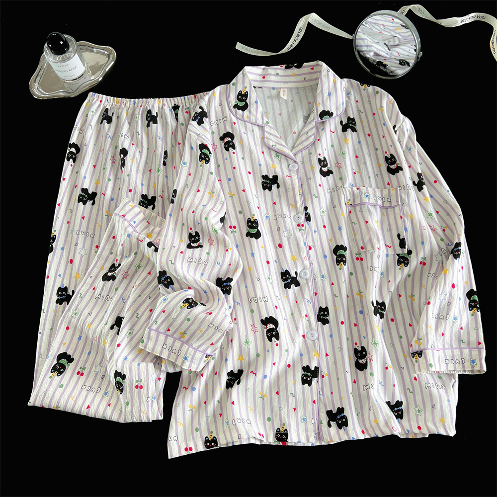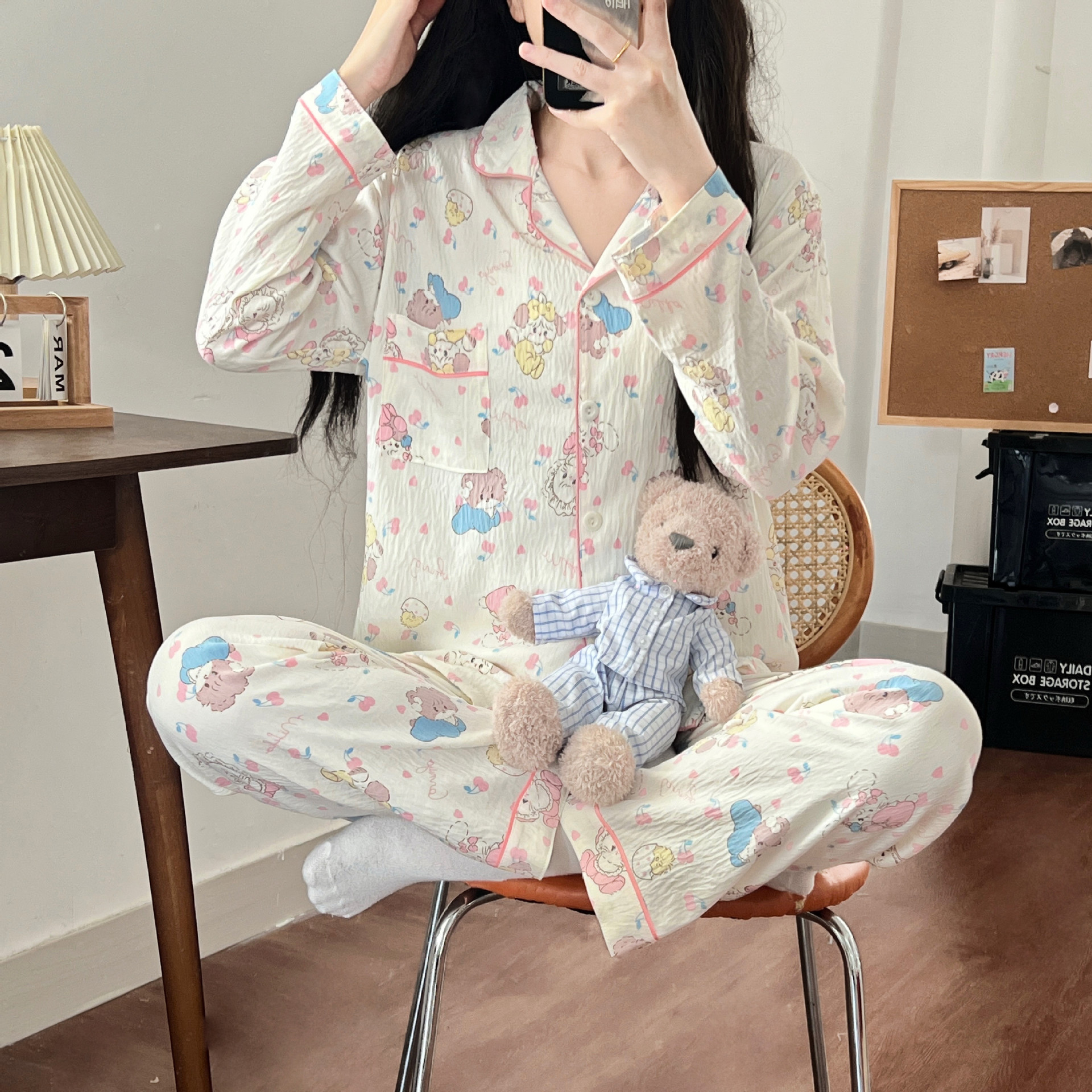 海外跨境专供睡衣女春秋云朵棉翻领开衫长袖宽松甜美家居服套装