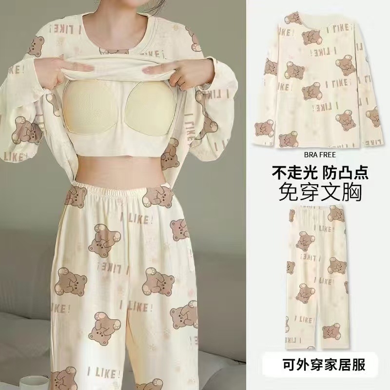 直播爆款云朵棉睡衣女长袖长裤带胸垫卡通宽松学院风家居服女套装