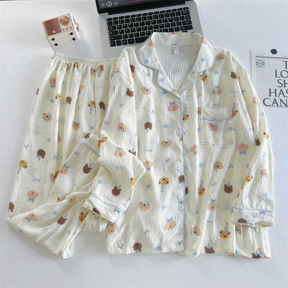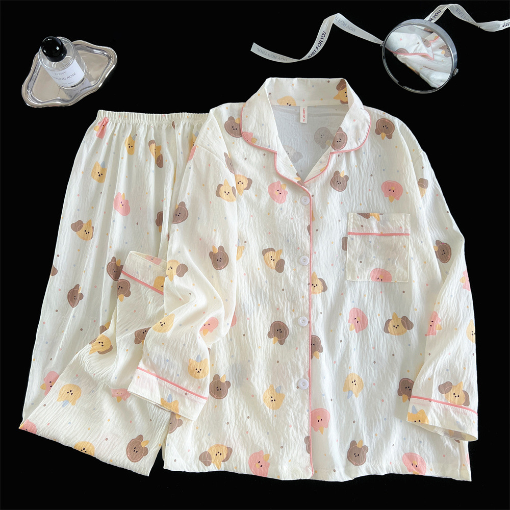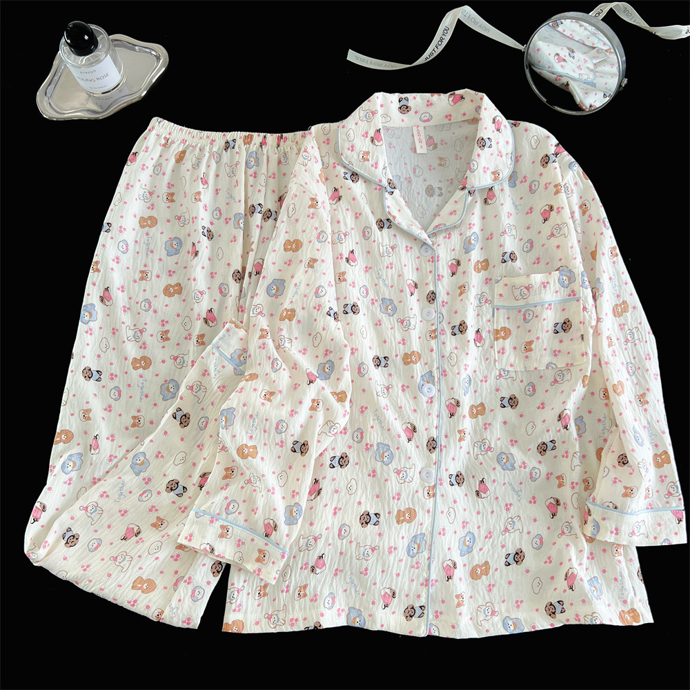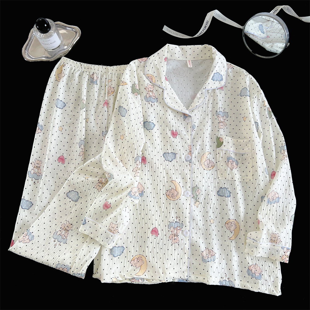 女性用クロスボーダーパジャマ、春と秋のクラウドコットンラペルカーディガン、カレッジスタイル長袖ゆったり甘くてかわいいホームウェアセット