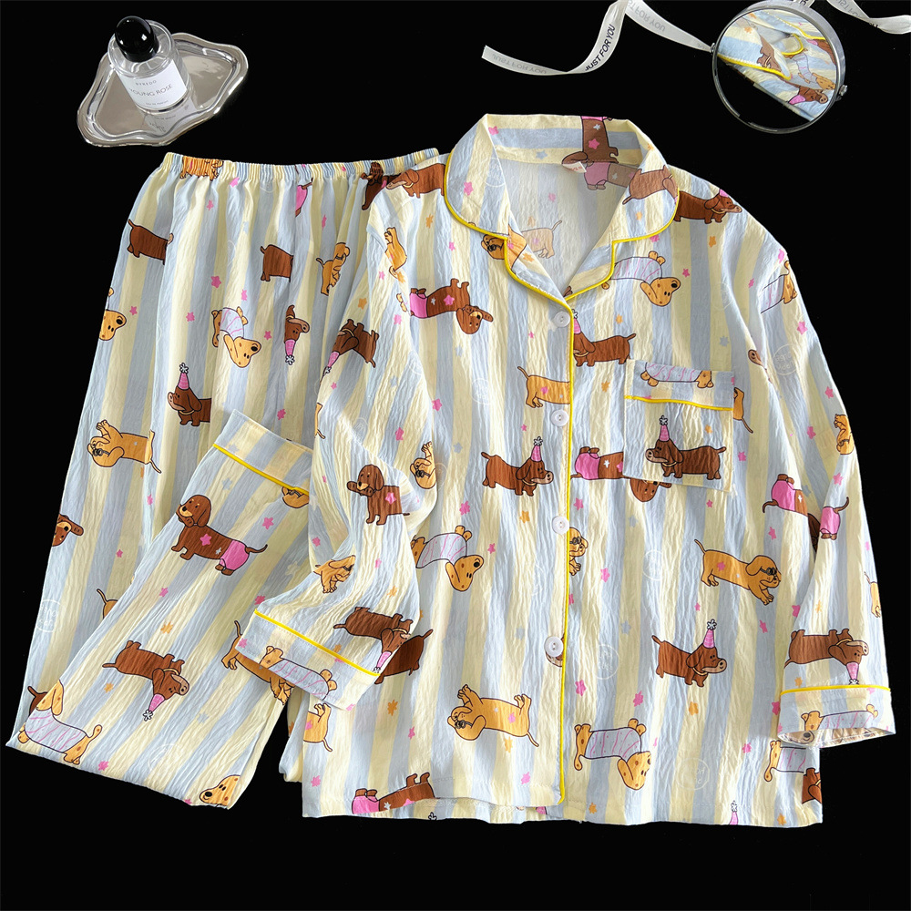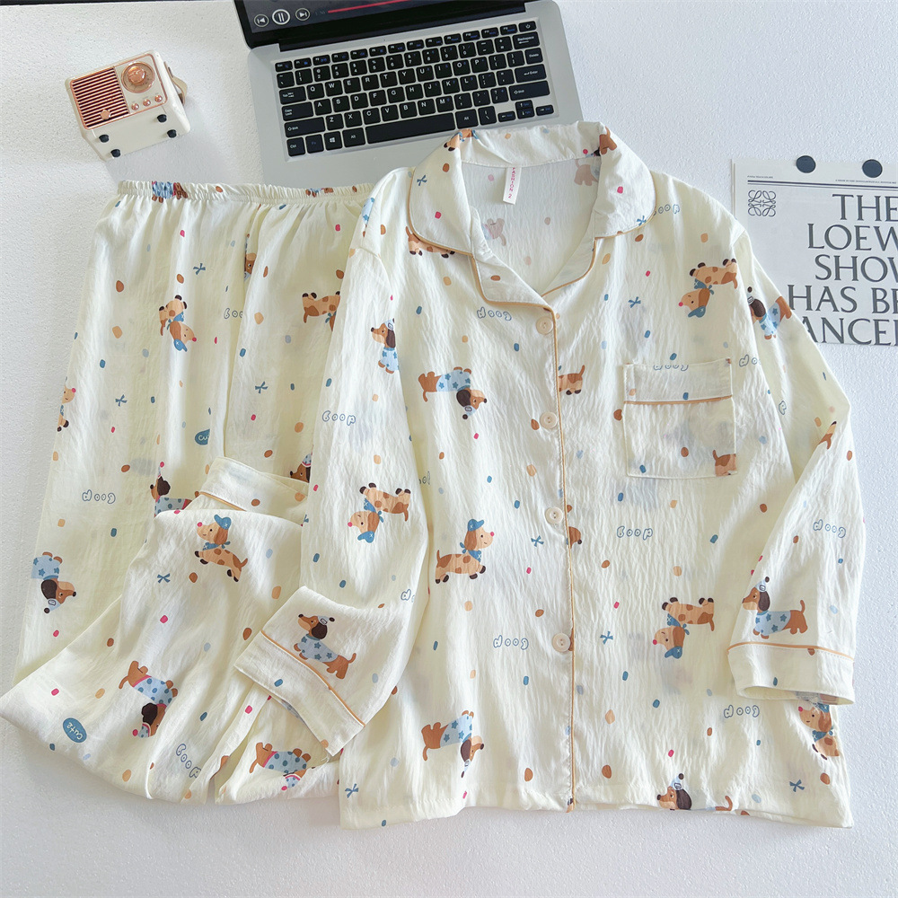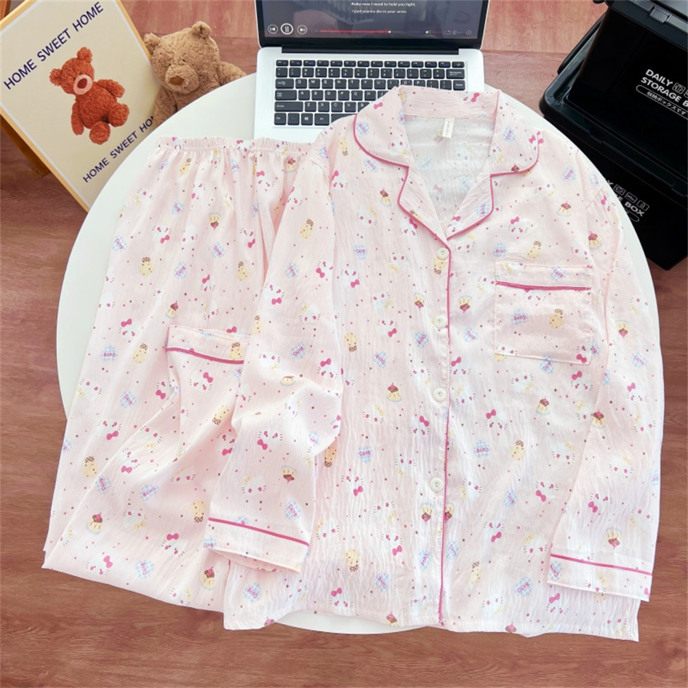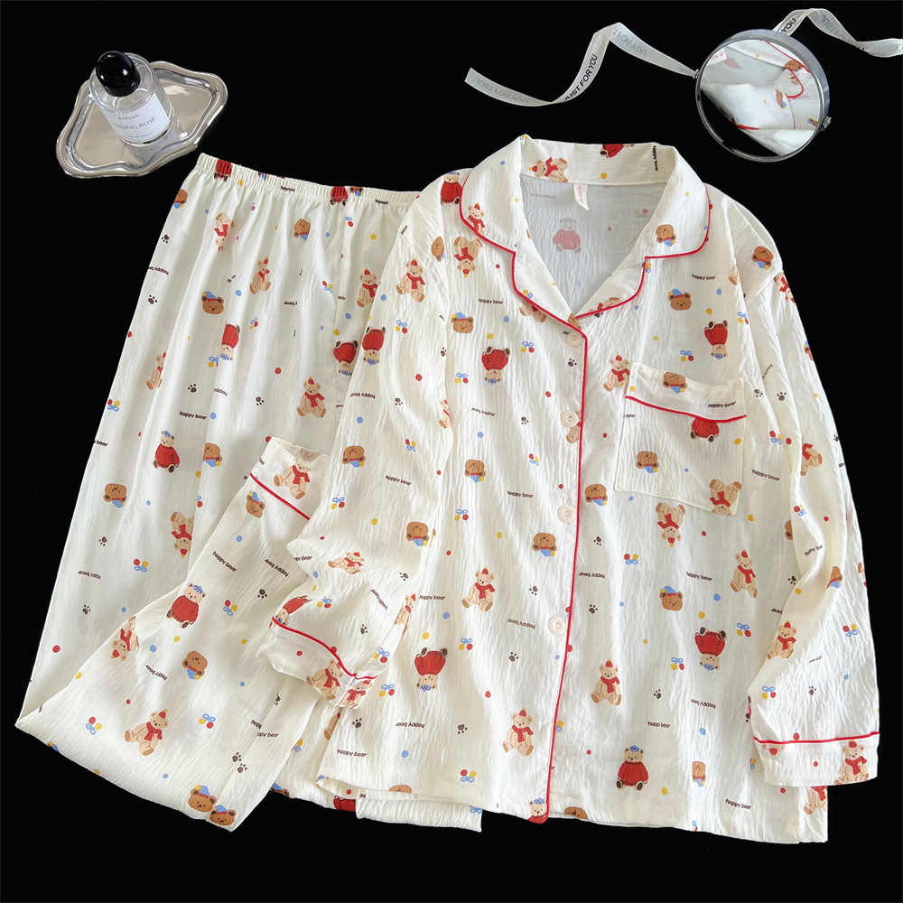 女性用クロスボーダーパジャマ、春と秋のクラウドコットンラペルカーディガン、カレッジスタイル長袖ゆったり甘くてかわいいホームウェアセット