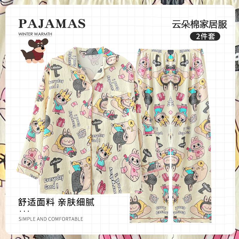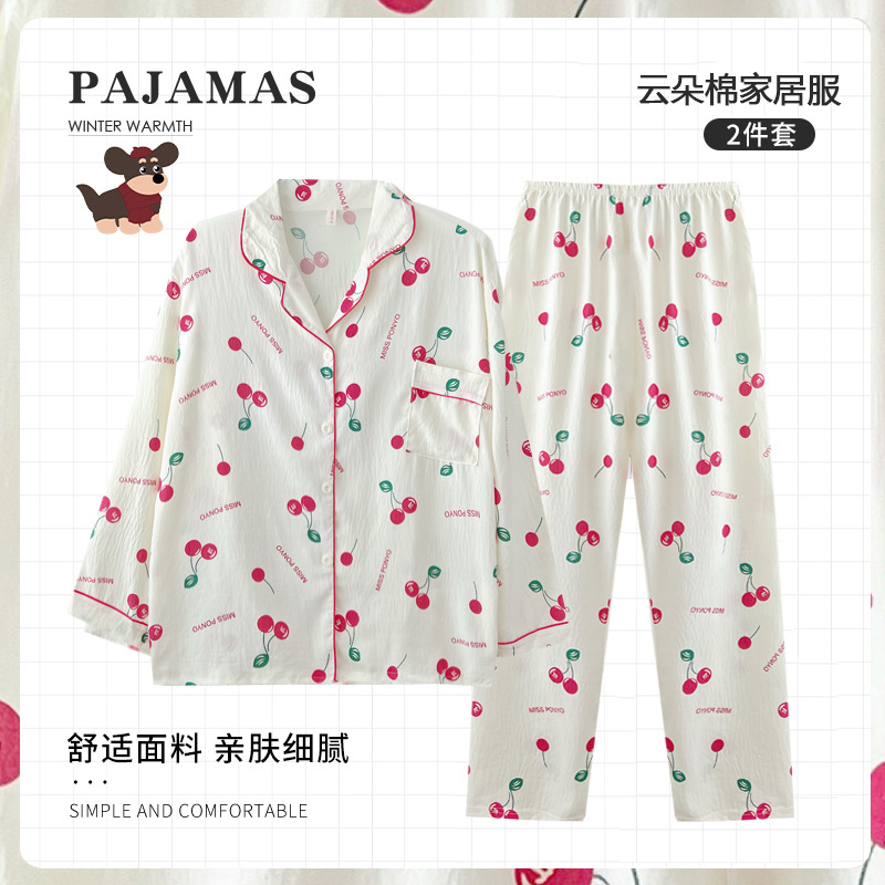 跨境直播睡衣女春秋云朵棉翻领开衫长袖长裤卡通甜美家居服女套装