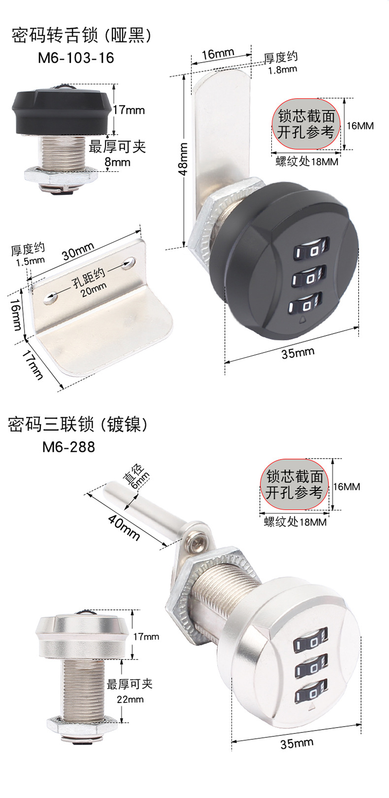 仕様 M6/103-16B コンビネーションロック(ニッケルメッキ),M6/103-16B ダイヤル錠(マットブラック),M6/103-30B コンビネーションロック(ニッケルメッキ),M6/103-30B ダイヤル錠(マットブラック),M6/288 コンビネーションロック(ニッケルメッキ),M6/288 パスワードロック(マットブラック)