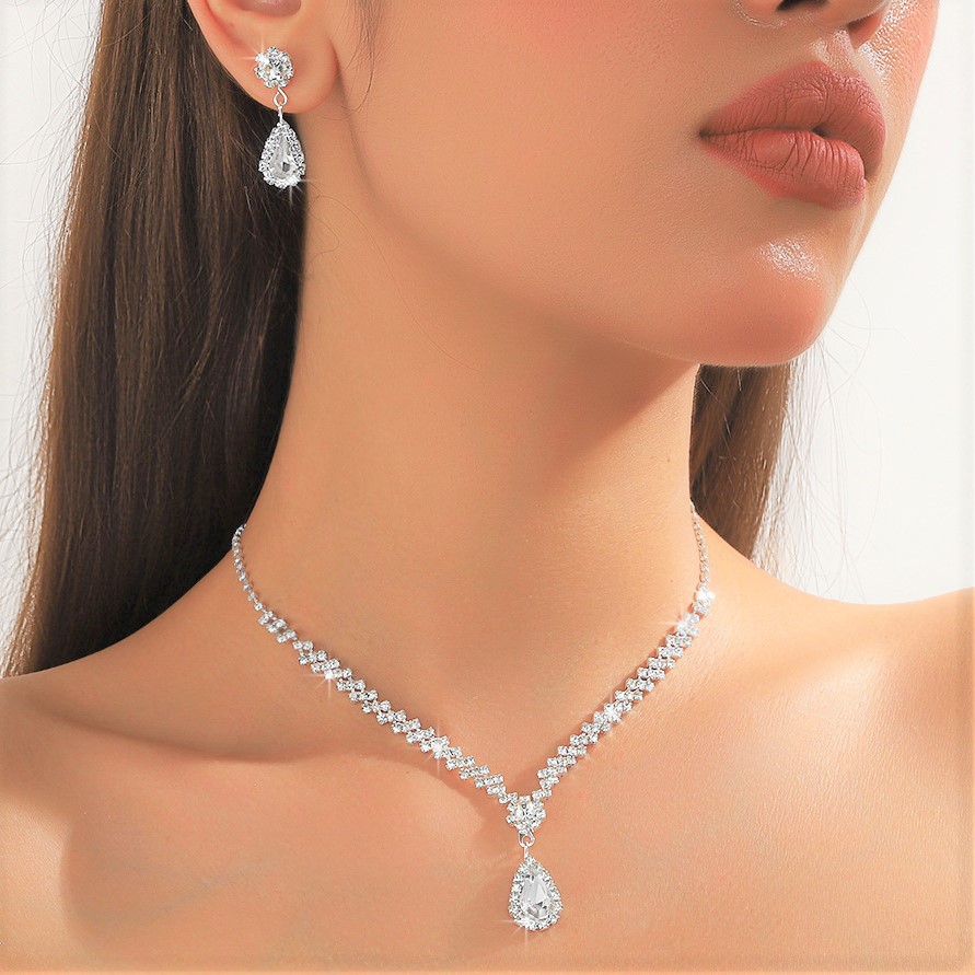 新娘首饰女士套装跨境欧美水晶水滴项链耳环两件套配饰时尚百搭