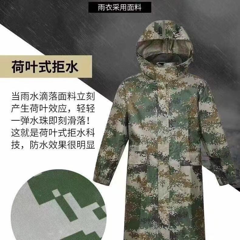 ファッション迷彩の長いレインコートは豪雨を防ぎ、徒歩で釣りをします。