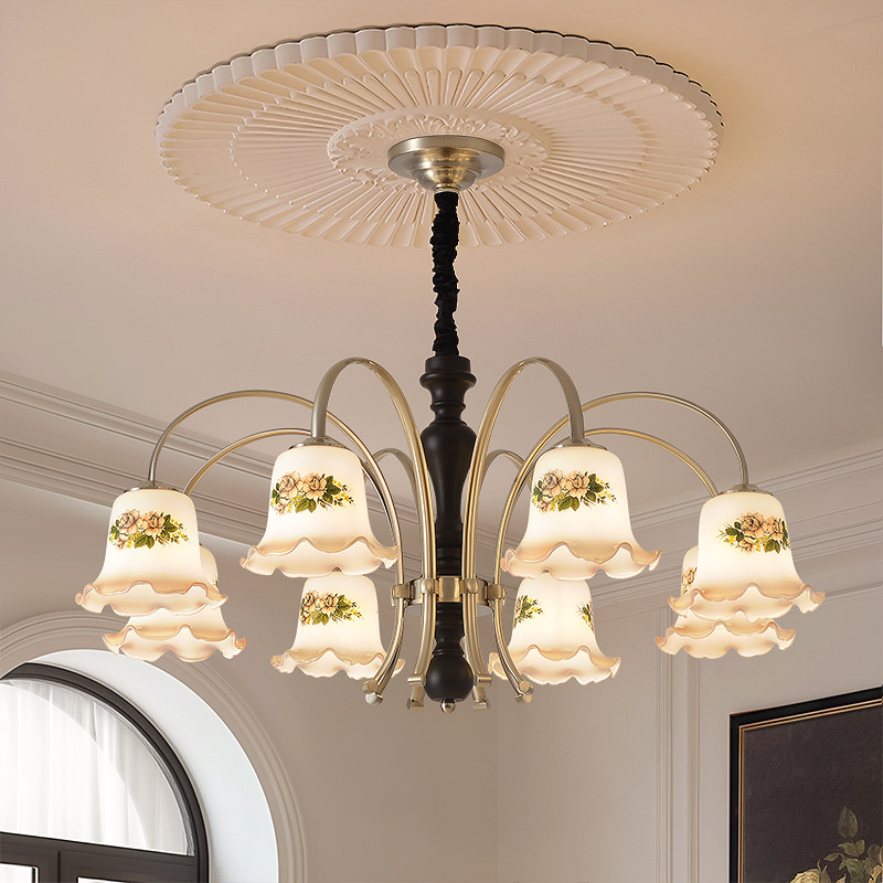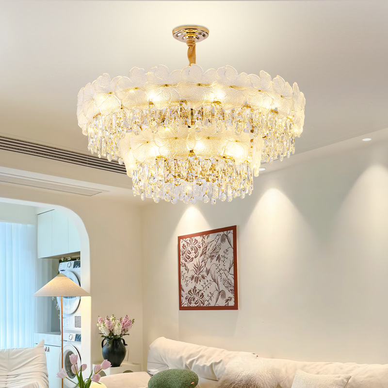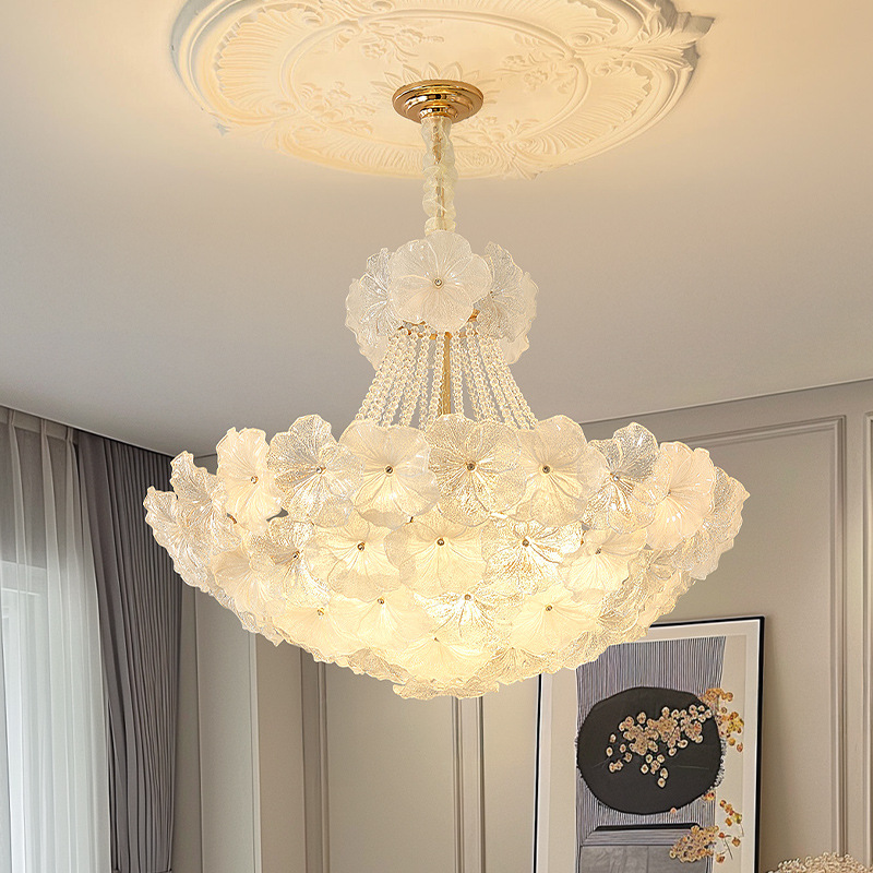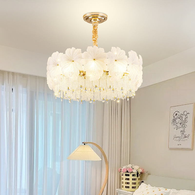 フレンチクリームスタイルリビングルームランプガラスフラワーホールランプダイニングルーム寝室クリスタルシャンデリア