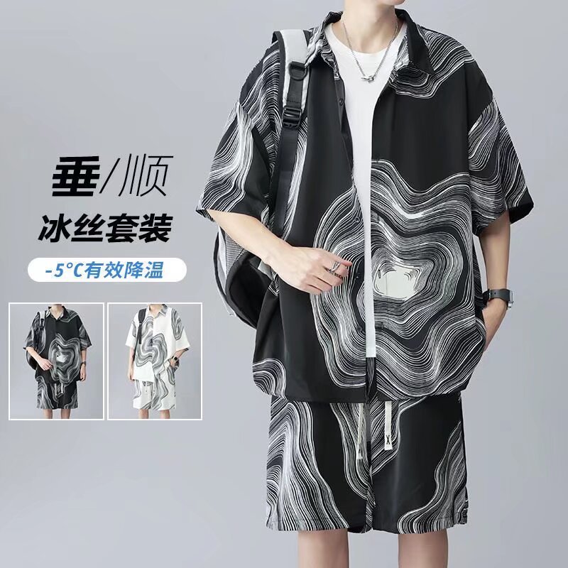 夏のアイスシルク半袖ショーツスーツメンズプラスファットプラスプリントTシャツトレンディなメンズカジュアルスポーツ2点セット