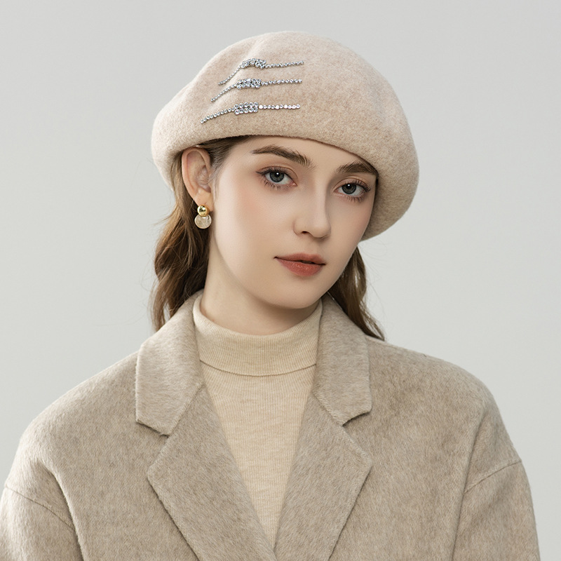 新款软贝雷帽女秋冬季英伦闪钻羊毛蓓蕾帽时尚百搭显脸小帽子批发