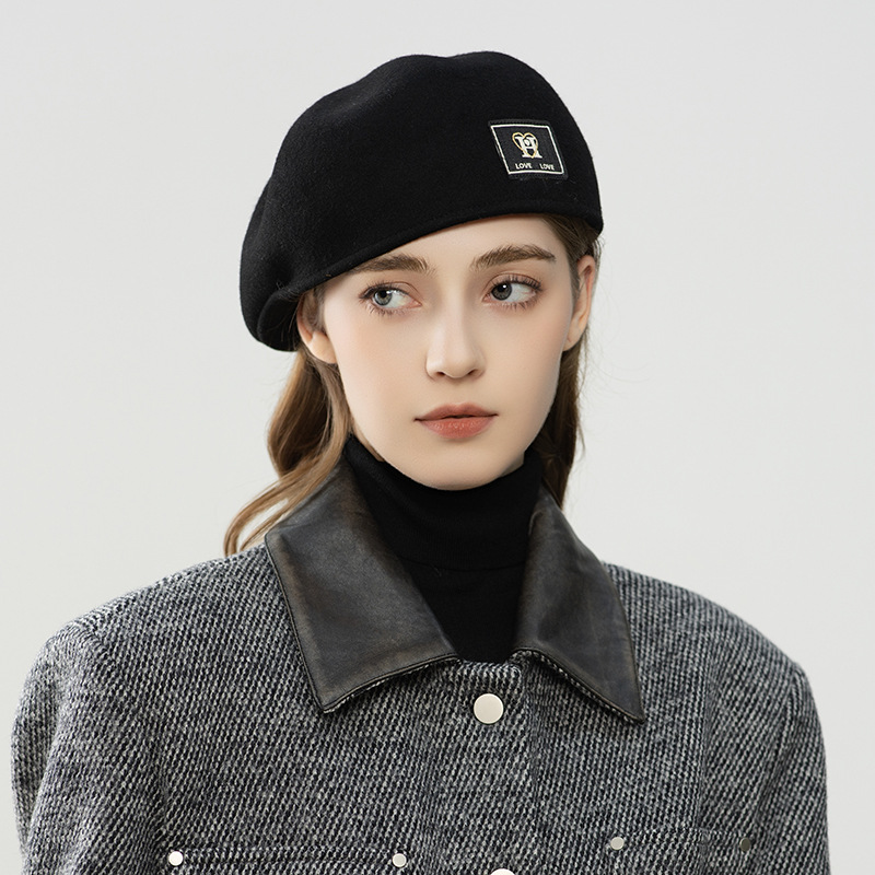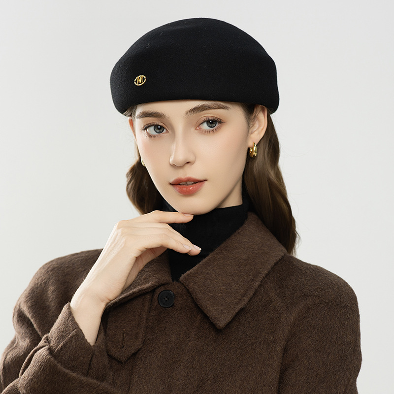 秋冬季新款英伦风羊毛帽简约字母装饰优雅贝雷帽女生保暖帽子批发