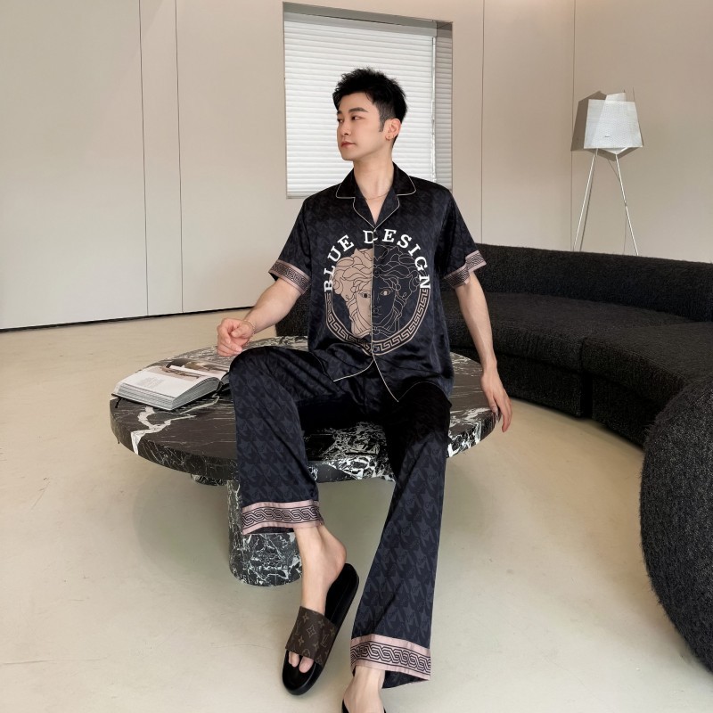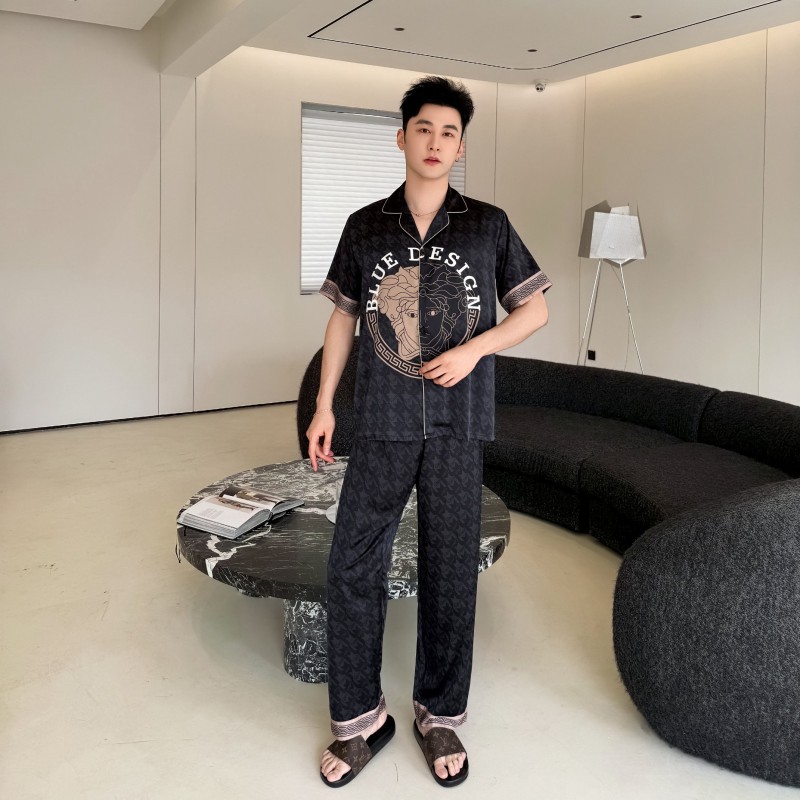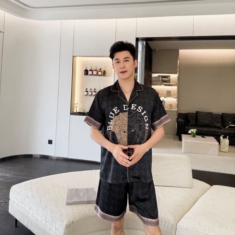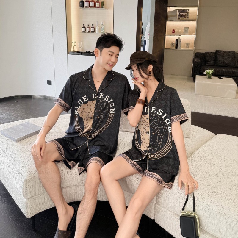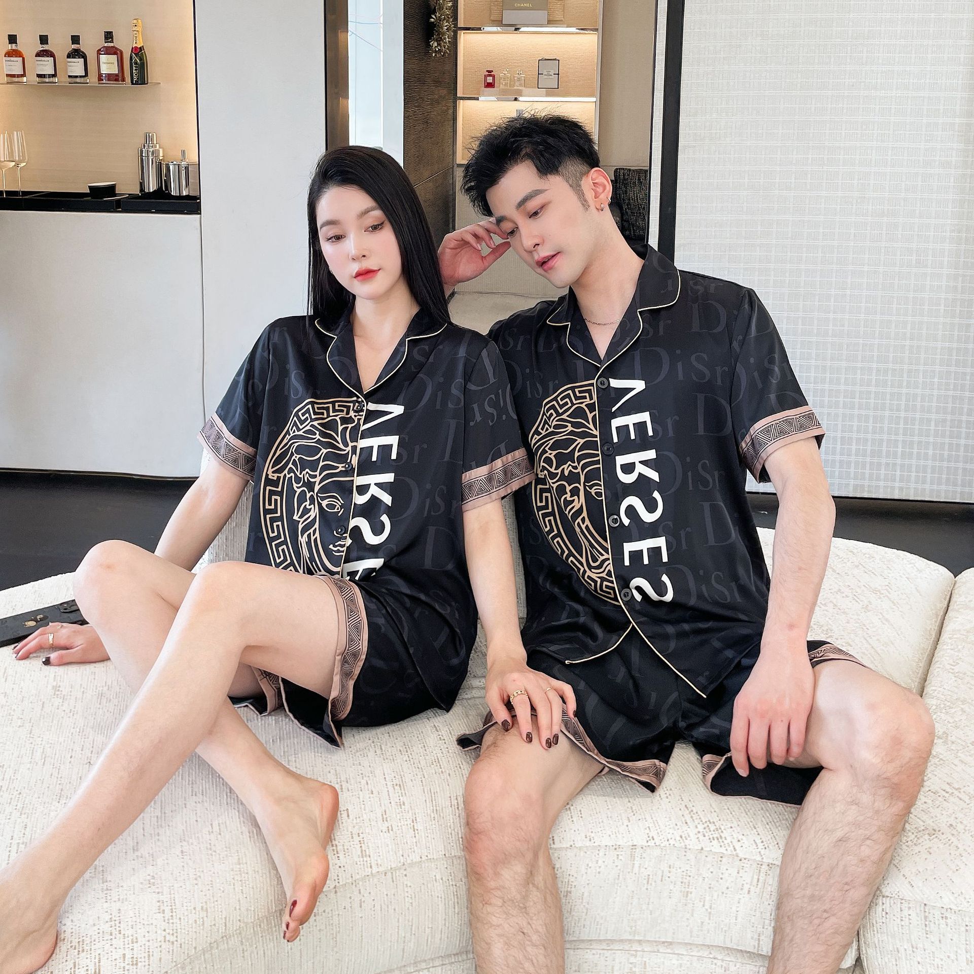 2025新型アイスカップルのパジャマの薄いタイプの黒い金の古い花の軽い豪華な半袖の半ズボンの家の服のスーツは外で着ることができます。