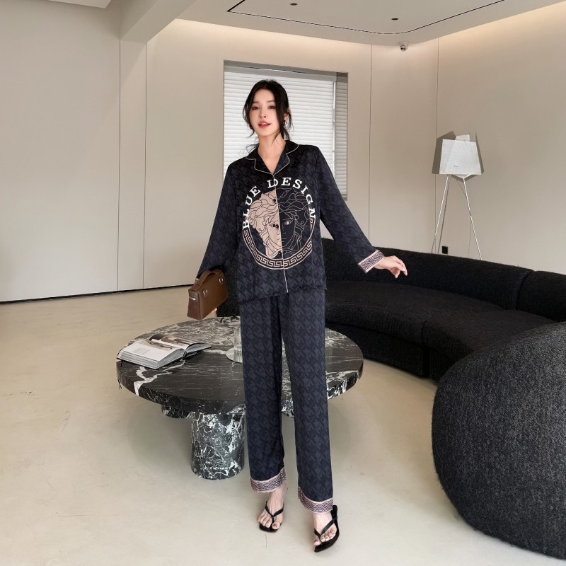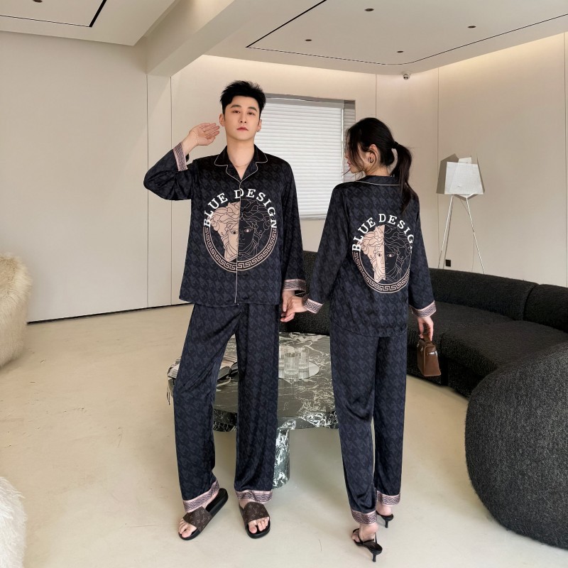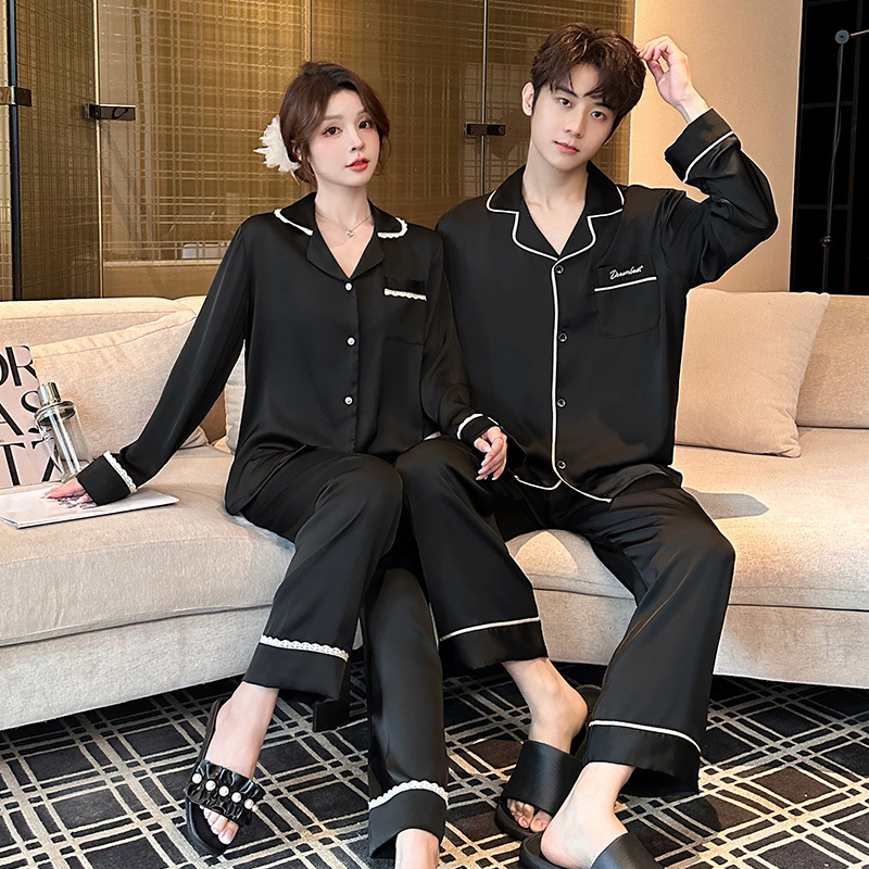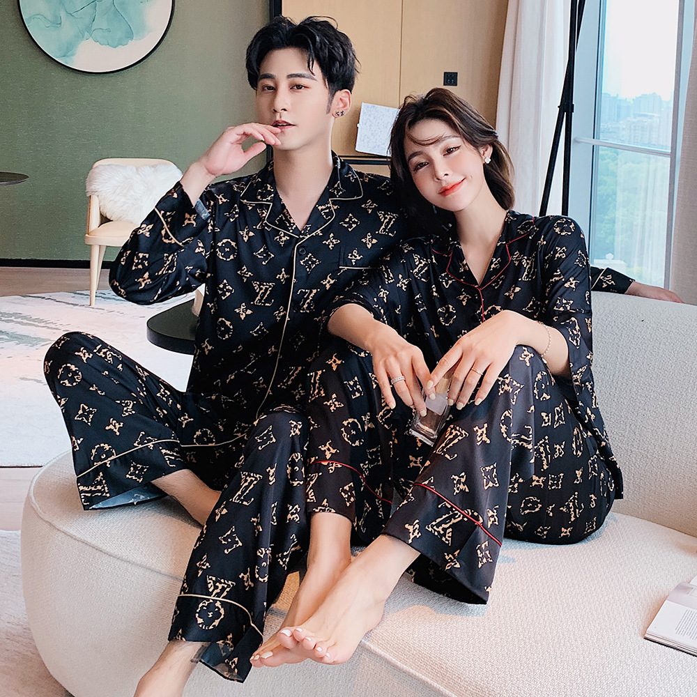 2024年カップルパジャマ春秋モデル女性用アイスシルク長袖長ズボン春夏男性用高級ホームウェア高級感
