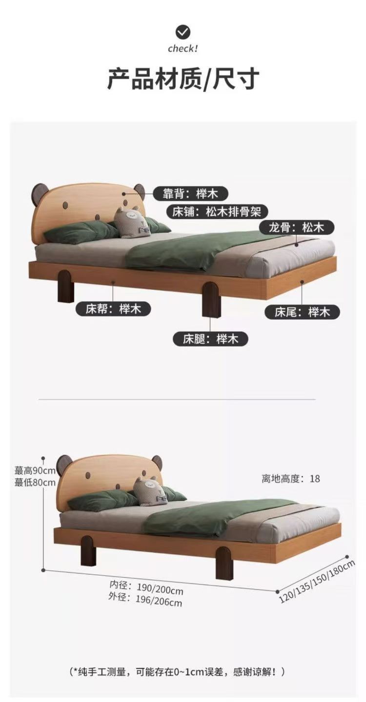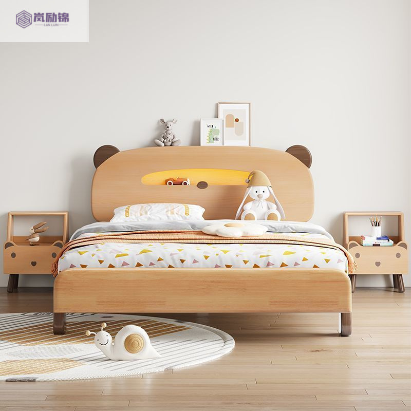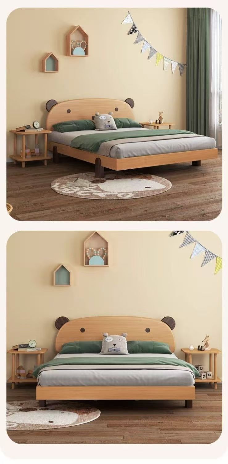 现代简约儿童木床小熊榉木双人床家用实木儿童卧室床头小眼可爱熊