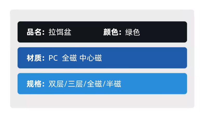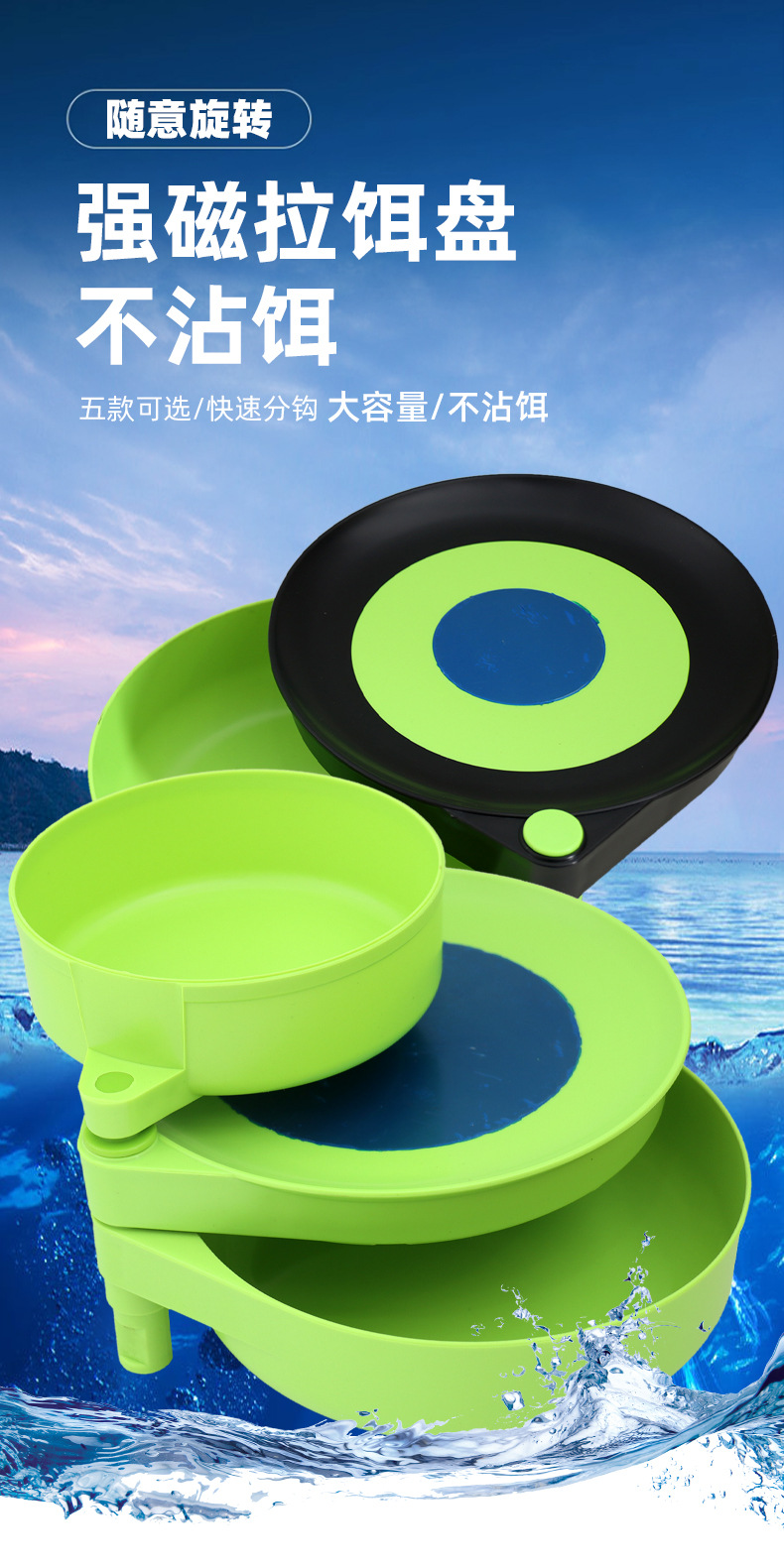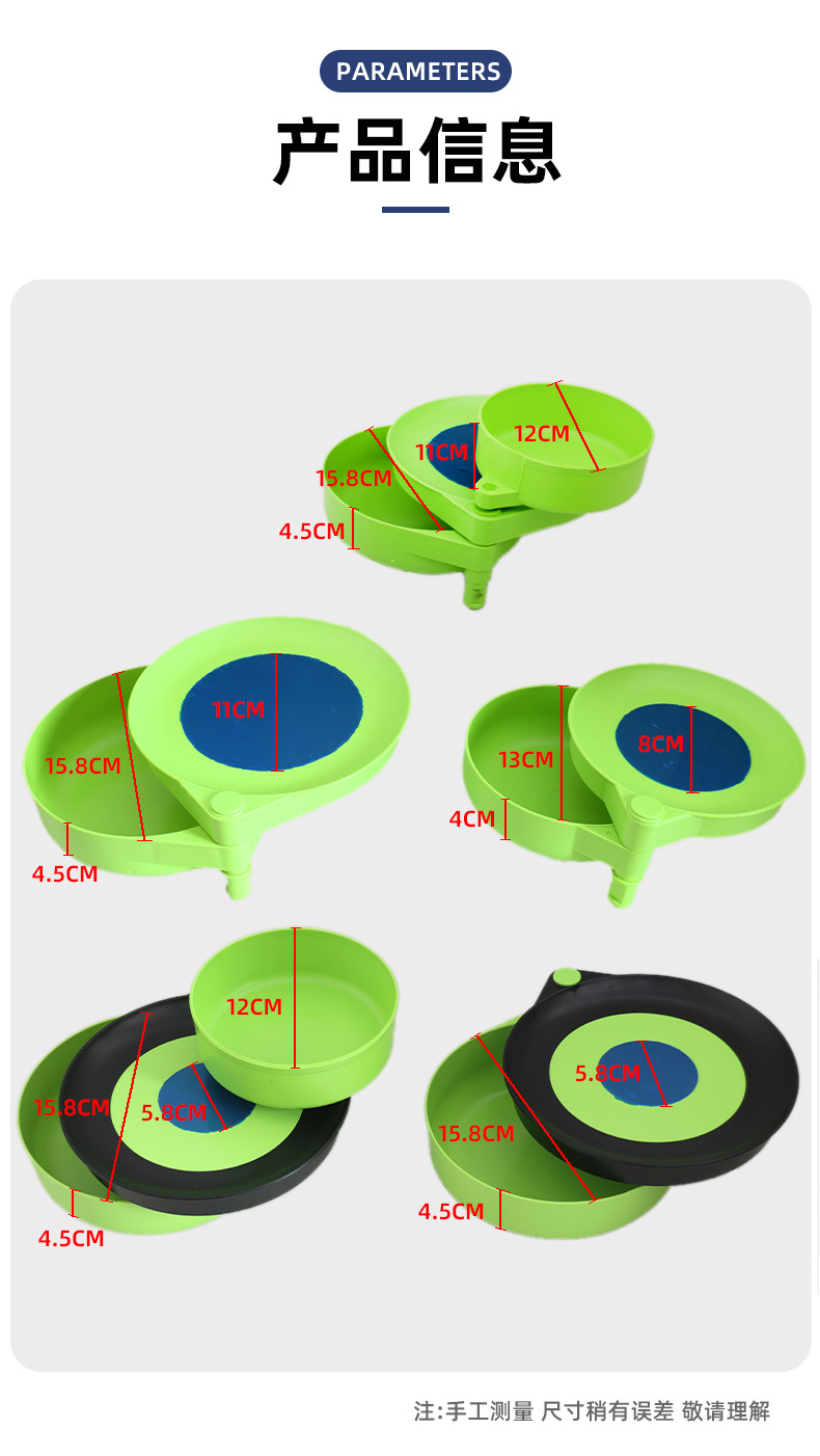 本款绿色拉饵盘分五个规格,17厘米有两层和三层,全磁和半磁的分别,14厘米为两层迷你盘,其中14厘米和17厘米半磁的内部为三颗磁铁,17厘米全磁的为七颗磁铁。下单时候请注意看清型号,以免拍错,如有详情图片标示不够详尽之处,可联系客服咨询,谢谢!