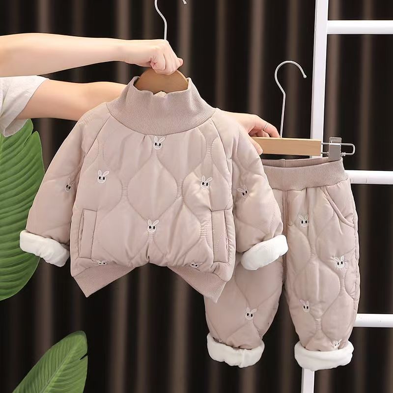 2025童装女宝宝纯色棉服加绒两件套冬季中小童半高领衍棉休闲套装