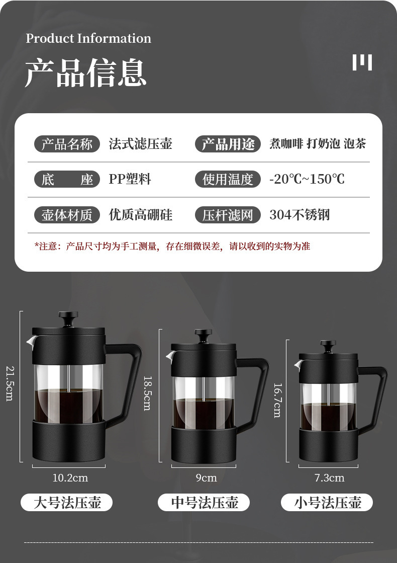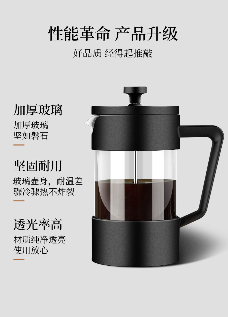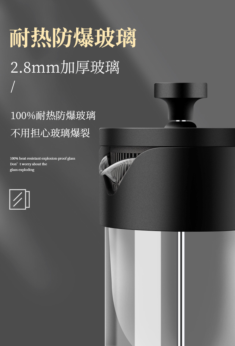 法圧ポットは高ホウ素シリコンガラスを厚くして、家庭用のフランス式フィルターポットでコーヒー器具を煮ます。