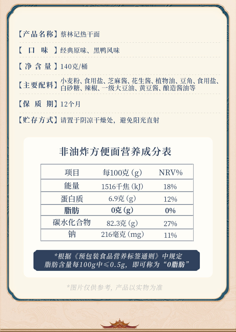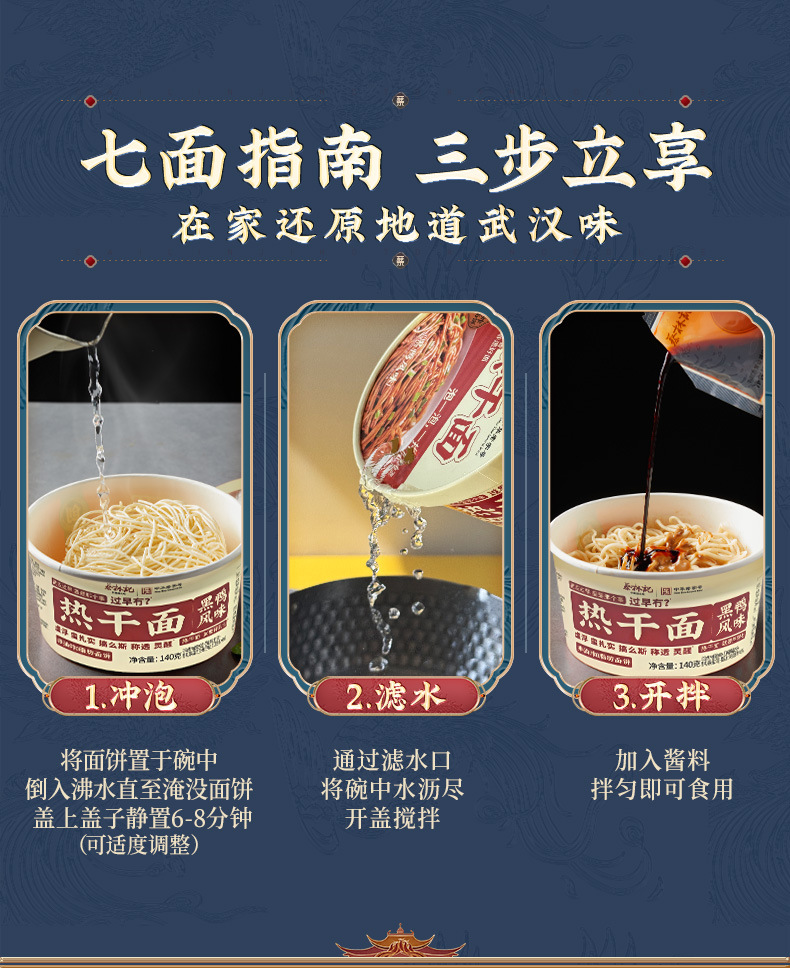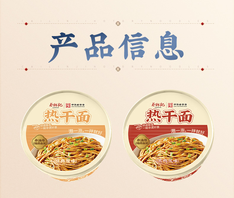 包装规格 【袋装】原味热干面150g(平台热销同款),【碗装】原味冲泡热干面140g(平台热销同款),【袋装】黑鸭脖味热干面150g(热销款),【碗装】黑鸭风味140g(热销款),【袋装】卤肉味袋装热干面150g,【袋装】红油味袋装热干面145g,【筒装】热干面碱水面500g,【筒装】热干面碱水面900g,【盒装】五人份热干面—原味700g,【盒装】五人份热干面—卤牛肉味675g,【盒装】五人份热干面—黑鸭脖味675g,【盒装】五人份热干面—小龙虾味675g