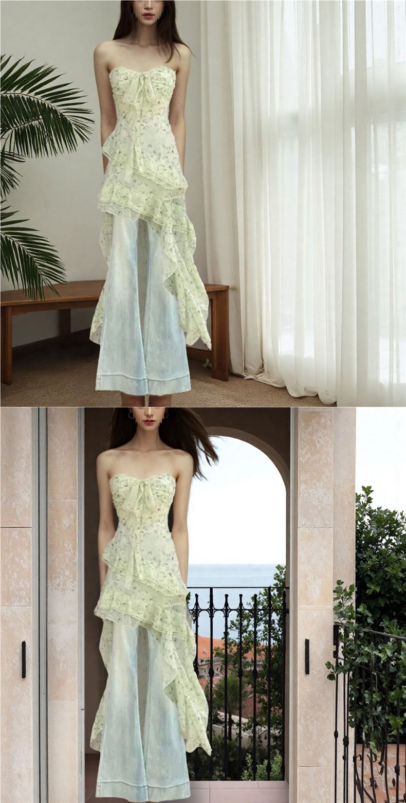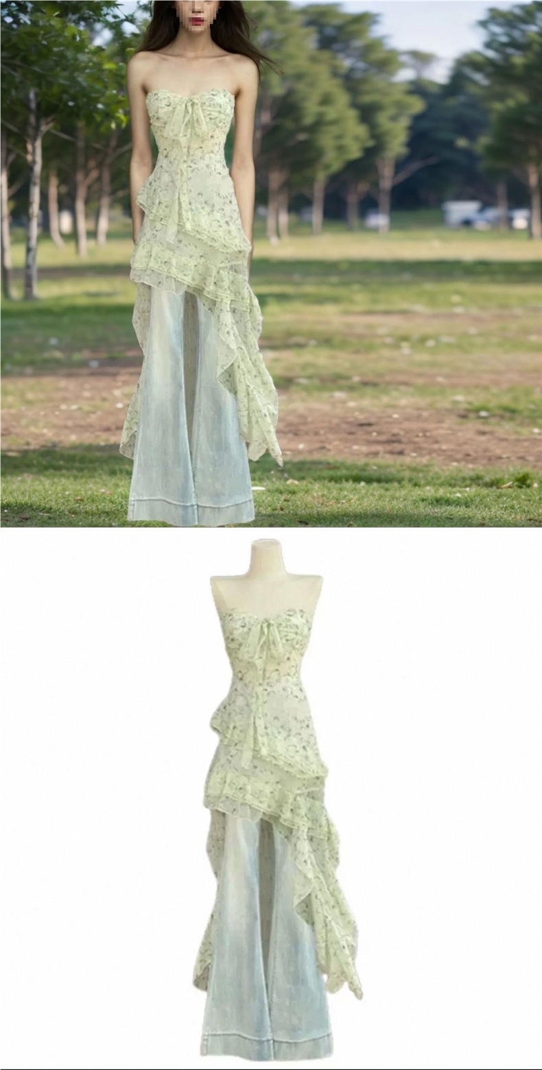 2025年夏の新しい韓国風不規則花柄ドレスとマイクロフレアジーンズの2点セット