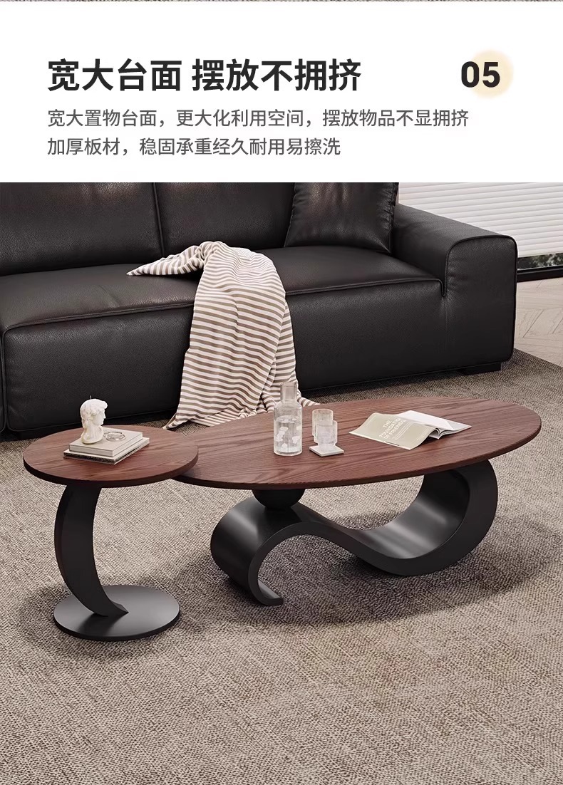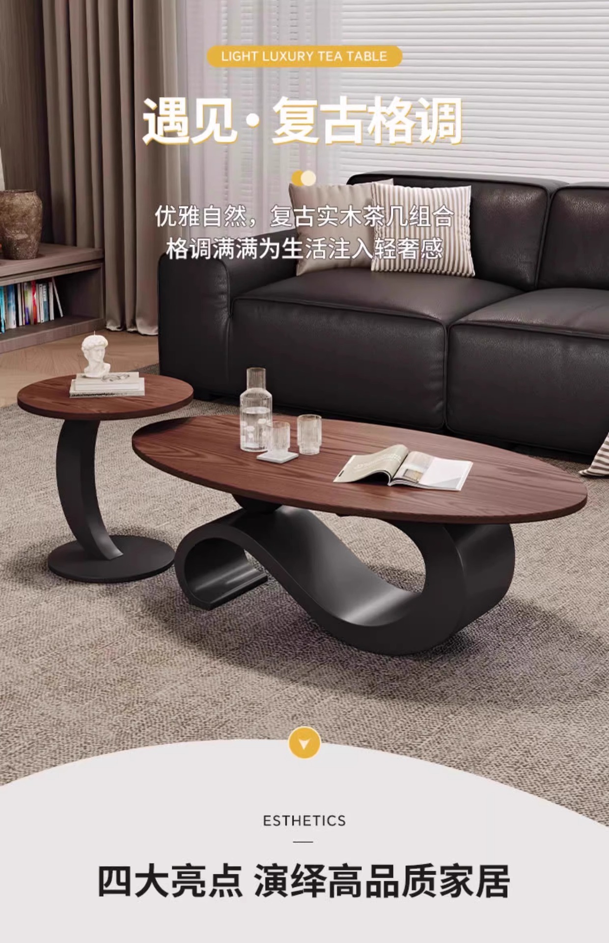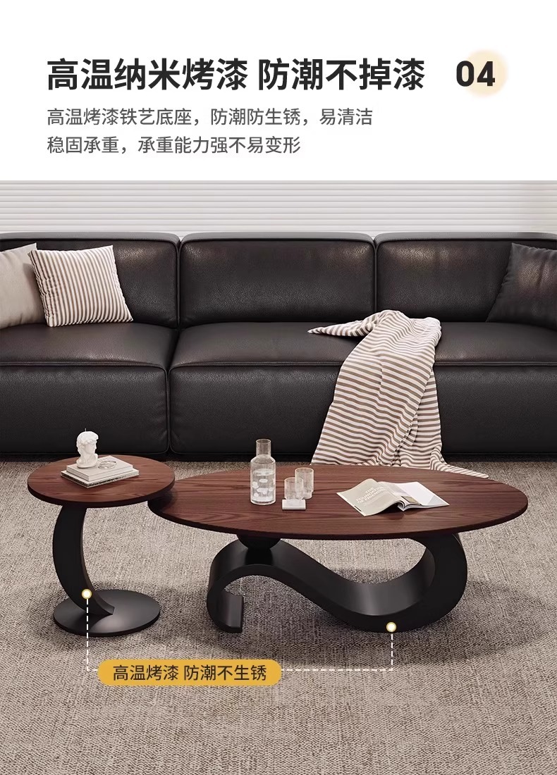 法式中古风椭圆形实木茶几胡桃木色家用客厅小户型简约高级感组合