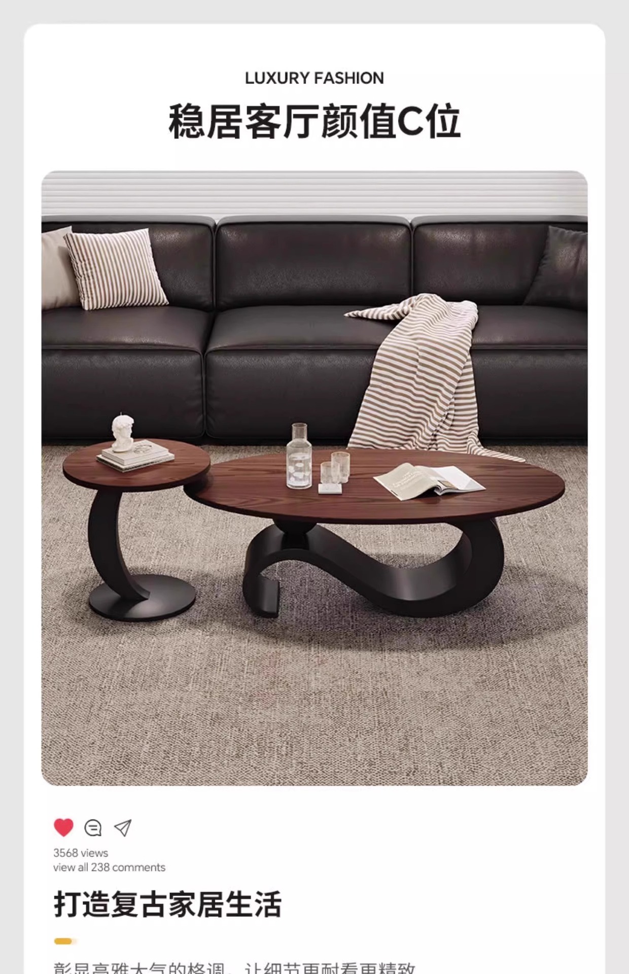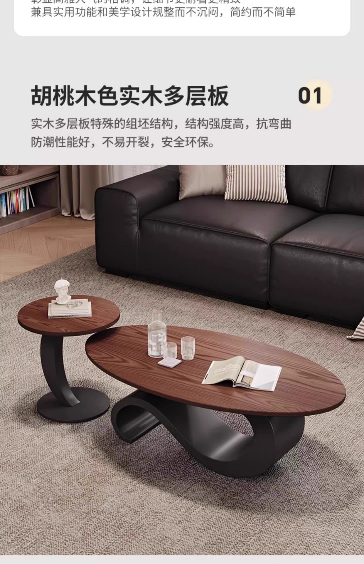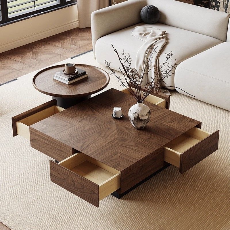 中古风胡桃木饰面茶几茶台家用客厅高端轻奢储物大小圆茶边几组合