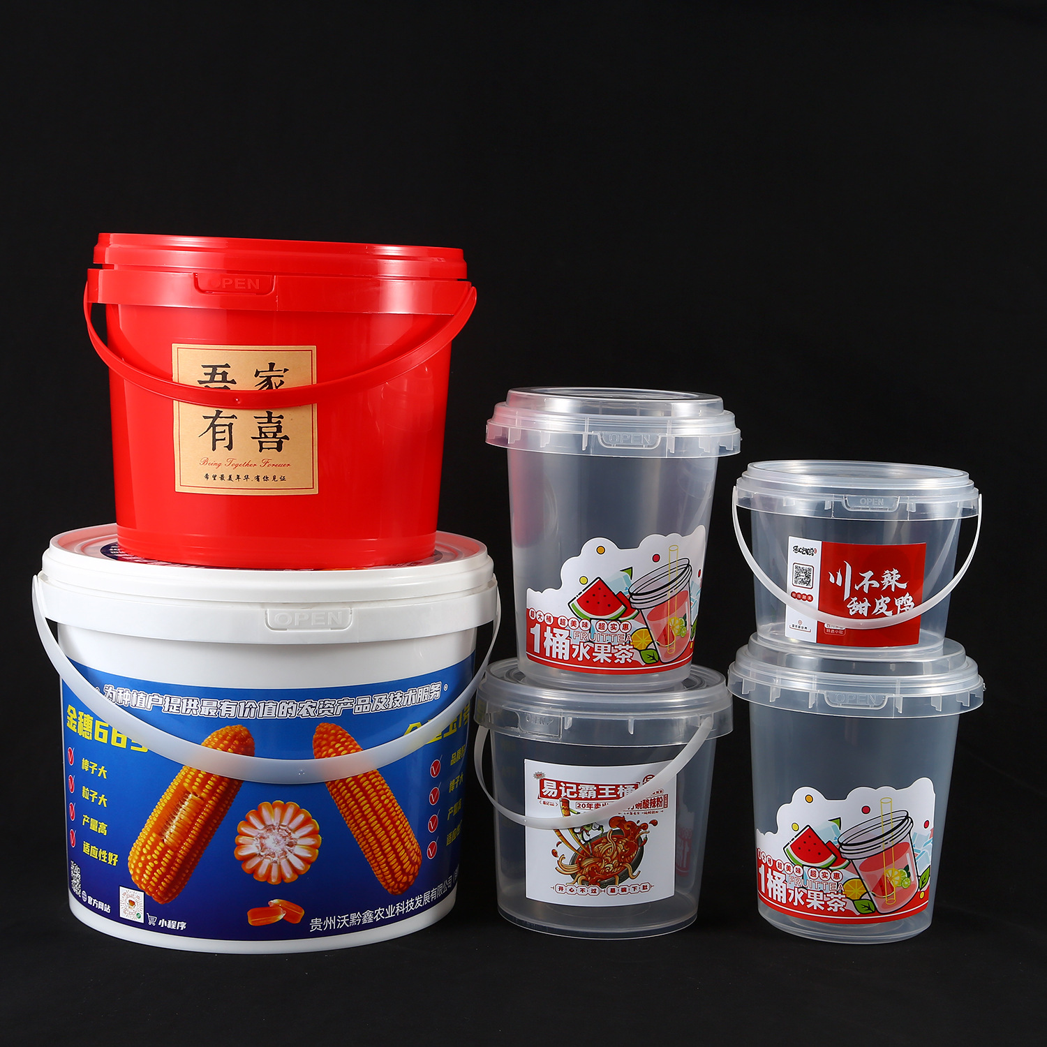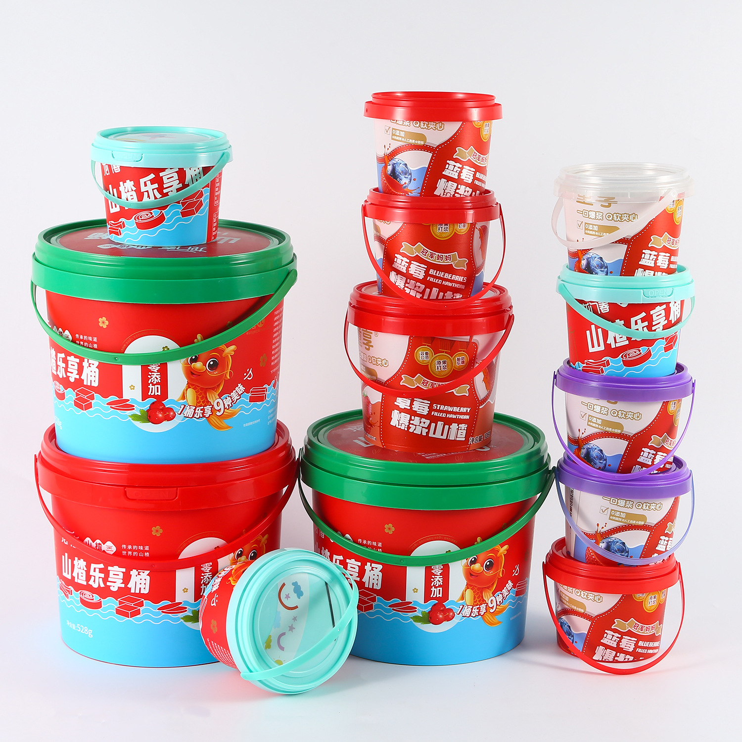 蓋付き食品グレードの携帯用バケツ、カラープリントのサンザシエンジョイバケツ、複数仕様の密封プラスチック丸型バケツ、小樽