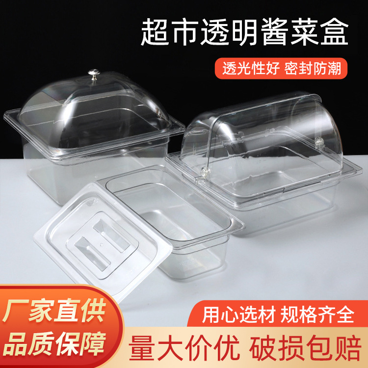 透明なプラスチックの食品の箱のスーパーマーケットの漬物の展示箱は屋台の鶏の爪の熟食の冷たい野菜の箱のアクリルの部数の箱を並べます。