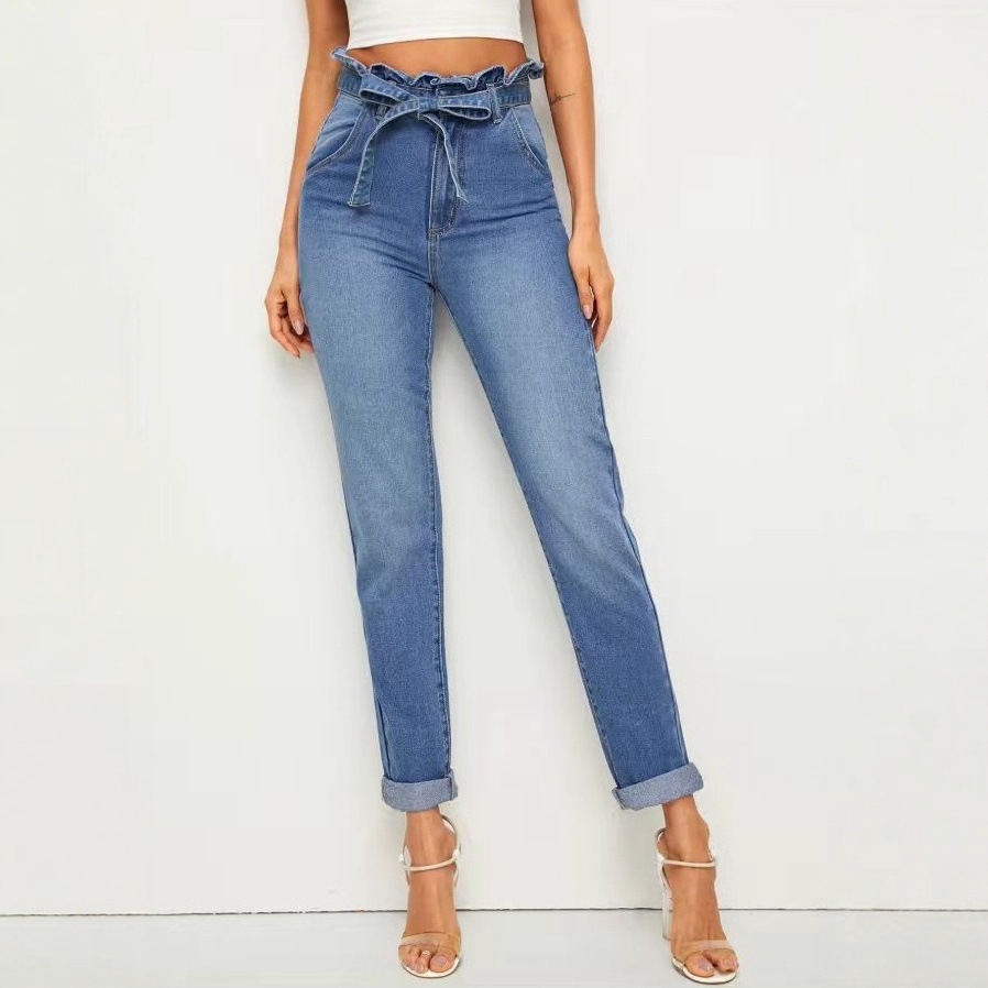 25跨境蝴蝶结小脚不规则抽绳弹力定位裤头卷边天蓝色图女牛仔长裤