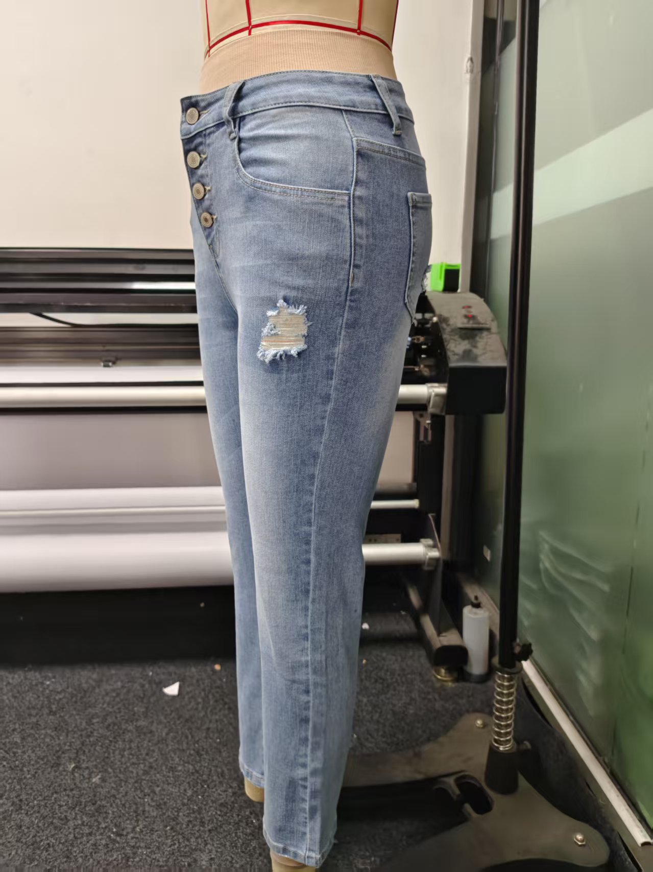 2025欧美单排扣弹力破洞女士休闲牛仔裤九分裤外贸修身跨境浅蓝色