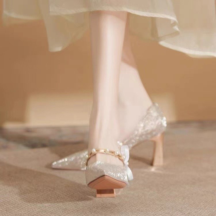 法式高跟鞋女不累脚粗跟婚鞋2025新款一字带尖头单鞋银色香槟色