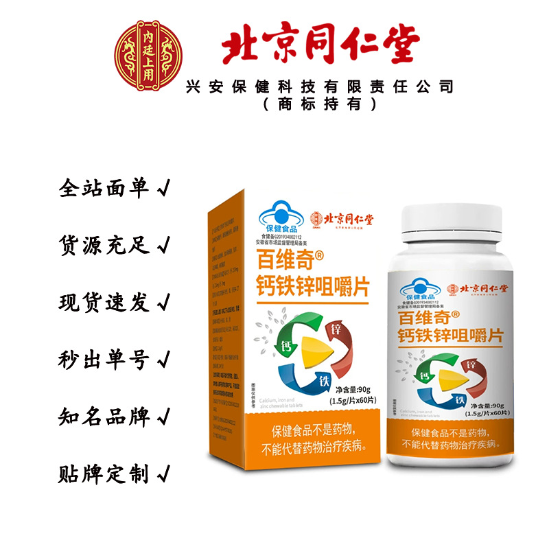 北京同仁堂御医匠百维奇钙铁锌咀嚼片 90克/瓶一件代发