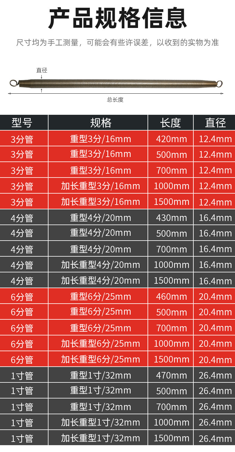 型号 3分/16mm【总长0.42m】,4分/20mm【总长0.43m】,6分/25mm【总长0.46m】,1寸/32mm【总长0.47m】,3分/16mm【总长0.5米】,4分/20mm【总长0.5米】,6分/25mm【总长0.5米】,1寸/32mm【总长0.5米】,3分/16mm【总长0.7m】,4分/20mm【总长0.7m】,6分/25mm【总长0.7m】,1寸/32mm【总长0.7m】,3分/16mm【总长1m】,4分/20mm【总长1m】,6分/25mm【总长1m】,1寸/32mm【总长1m】,3分/16mm【总长1.5m】,4分/20mm【总长1.5m】,6分/25mm【总长1.5m】,1寸/32mm【总长1.5m】