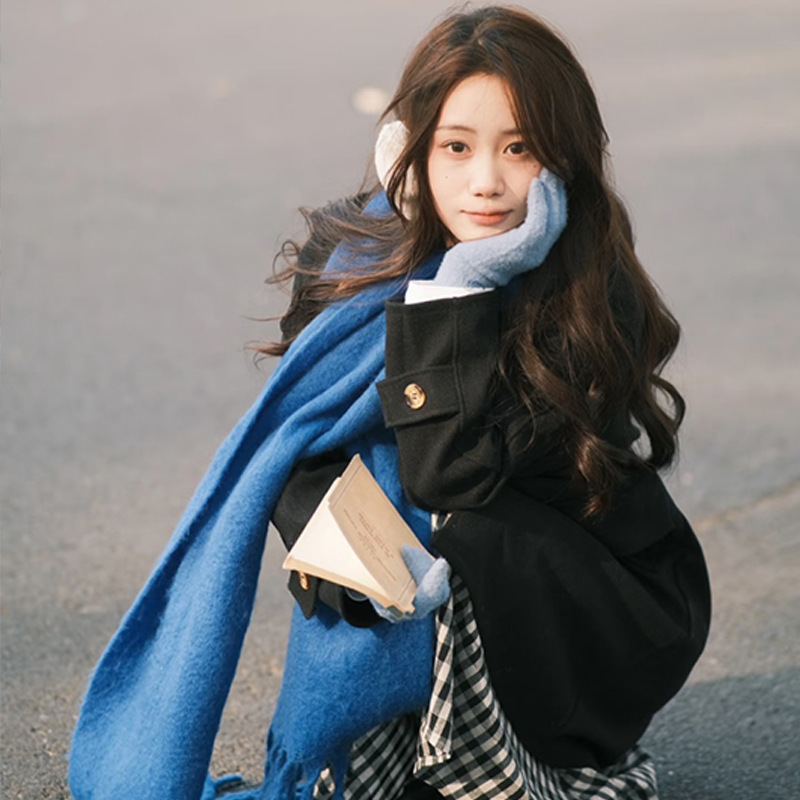 新款氛围感蓝色大围巾女冬季高级感保暖雪地穿搭围脖百搭纯色围巾