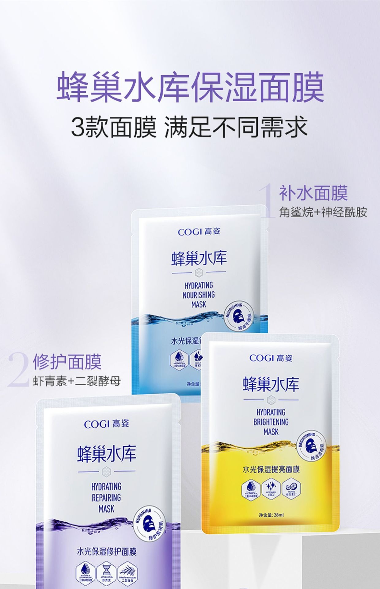 产品规格 水光保湿修护面膜 10片,水光保湿锁水面膜 10片,水光保湿焕采面膜 10片