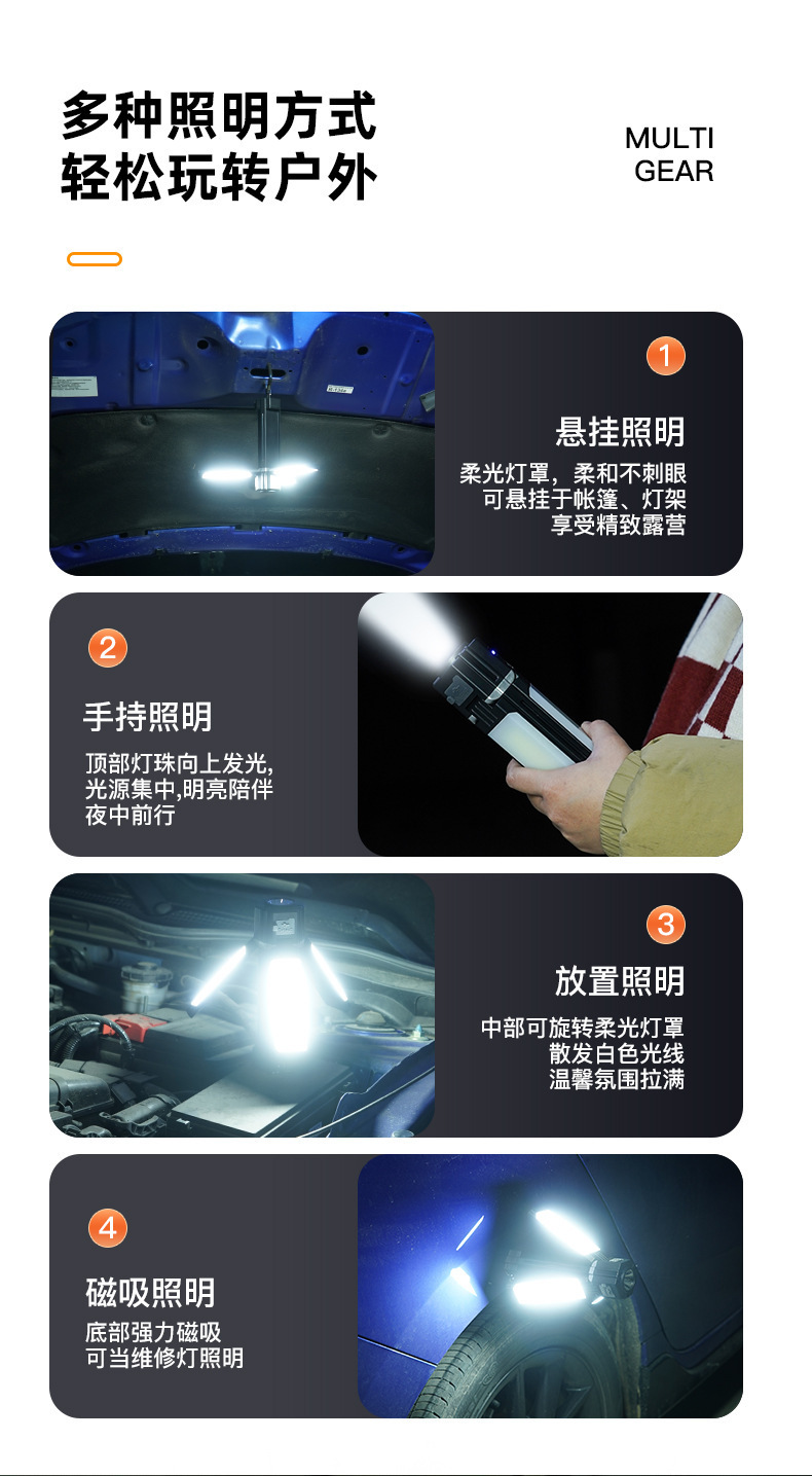 跨境新款多功能照明灯便携折叠户外露营灯带磁吸强光手电筒批发