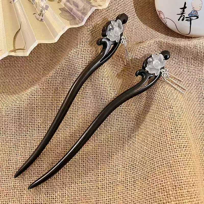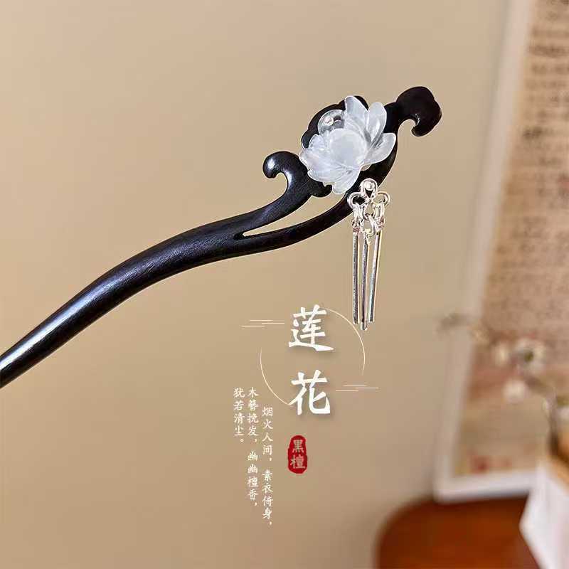 新中式古风双面莲花檀木发簪流苏盘发简约发钗轻奢高级感复古发饰