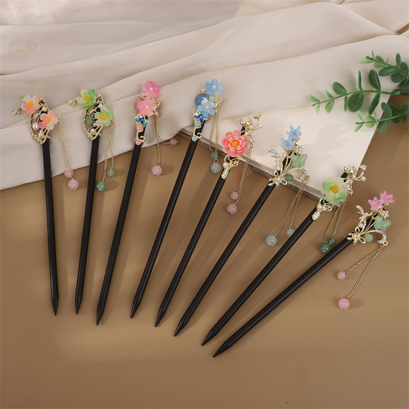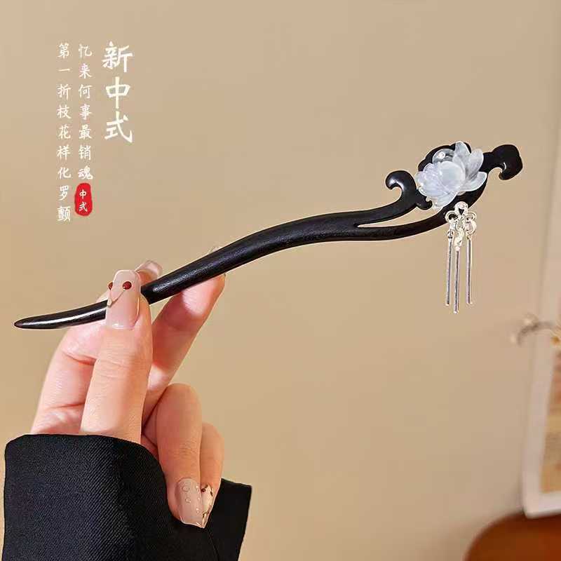 新中式流苏古风黑檀木发簪旗袍发钗汉服盘发簪子头饰马面裙配饰
