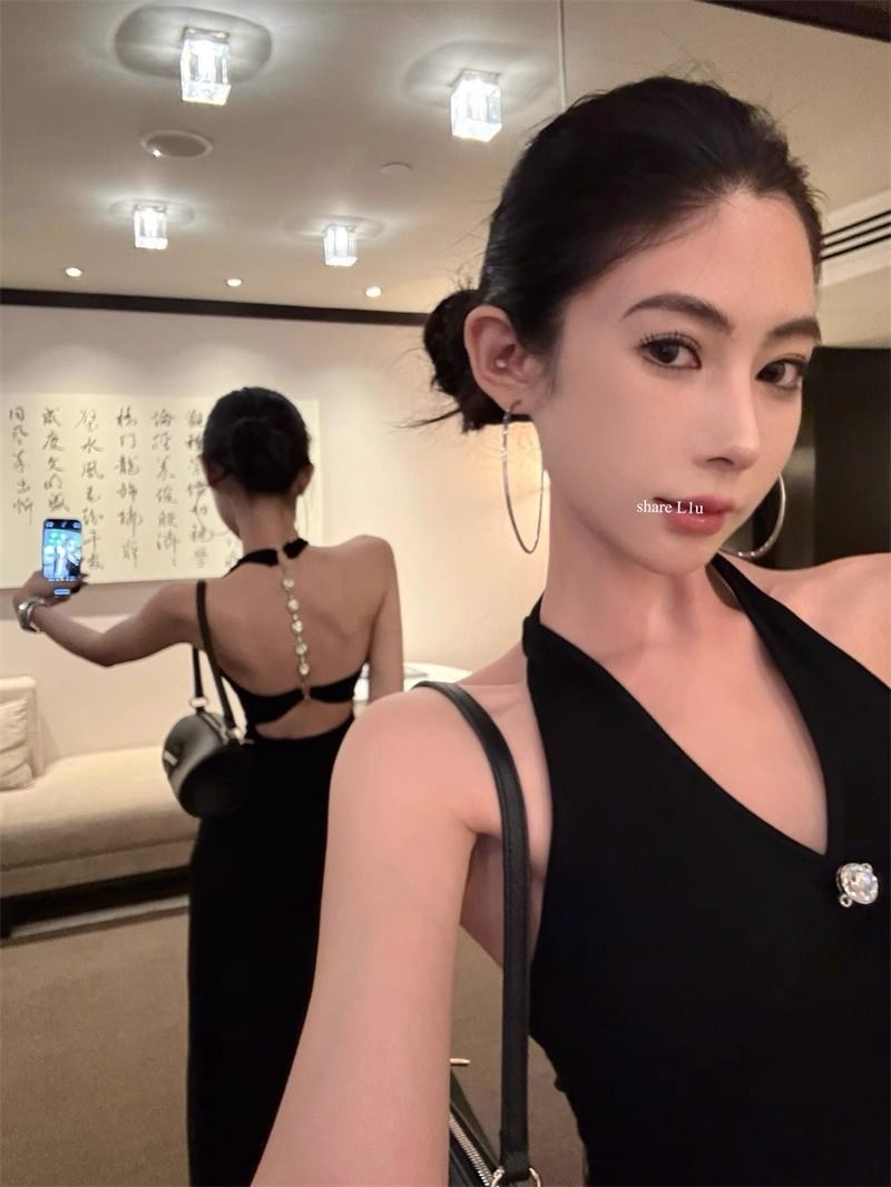设计感露背挂脖连衣裙女夏季御姐风修身礼服长裙黑色气质包臀裙子