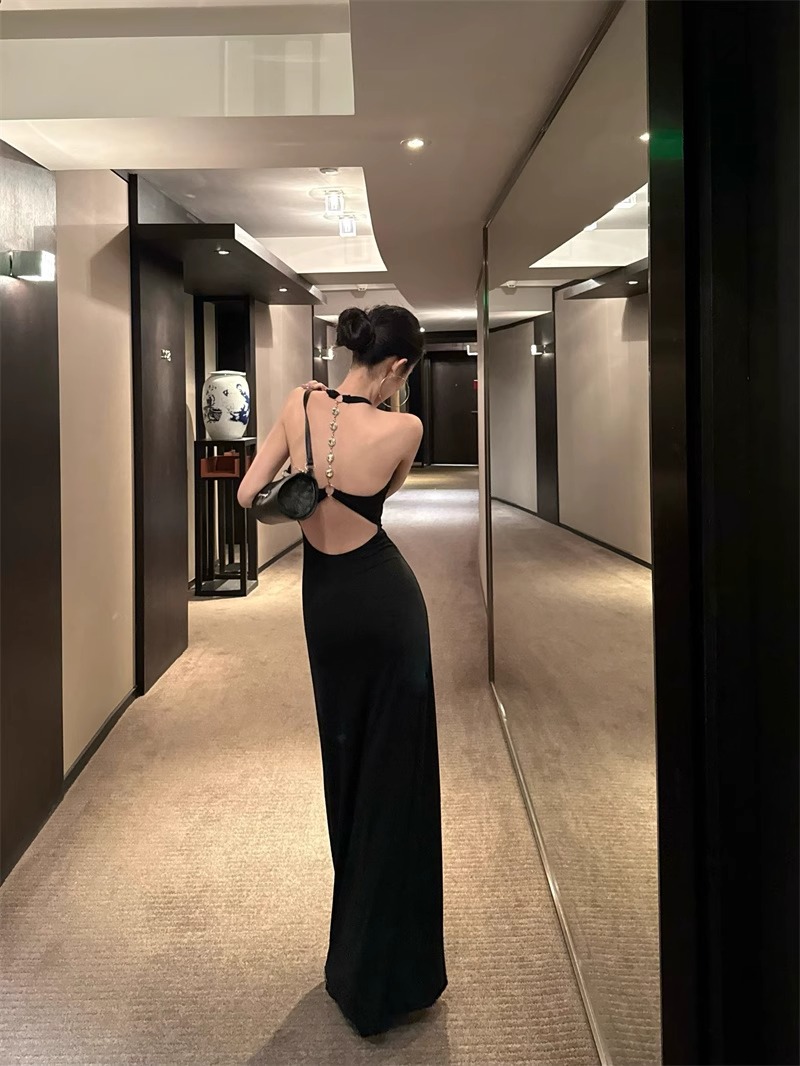 女性のためのデザインされたバックレスホルターネックドレス、夏のロイヤルシスタースタイルのスリムドレス、ロングスカート、黒の気質ヒップカバースカート