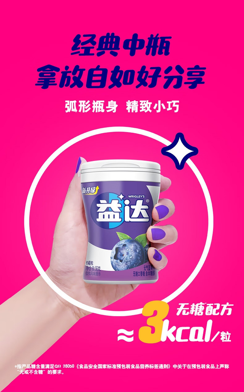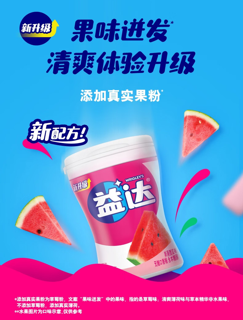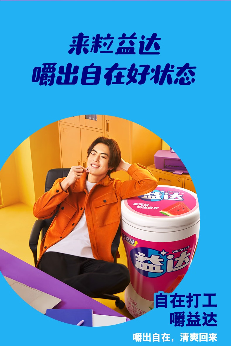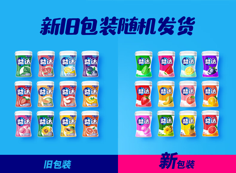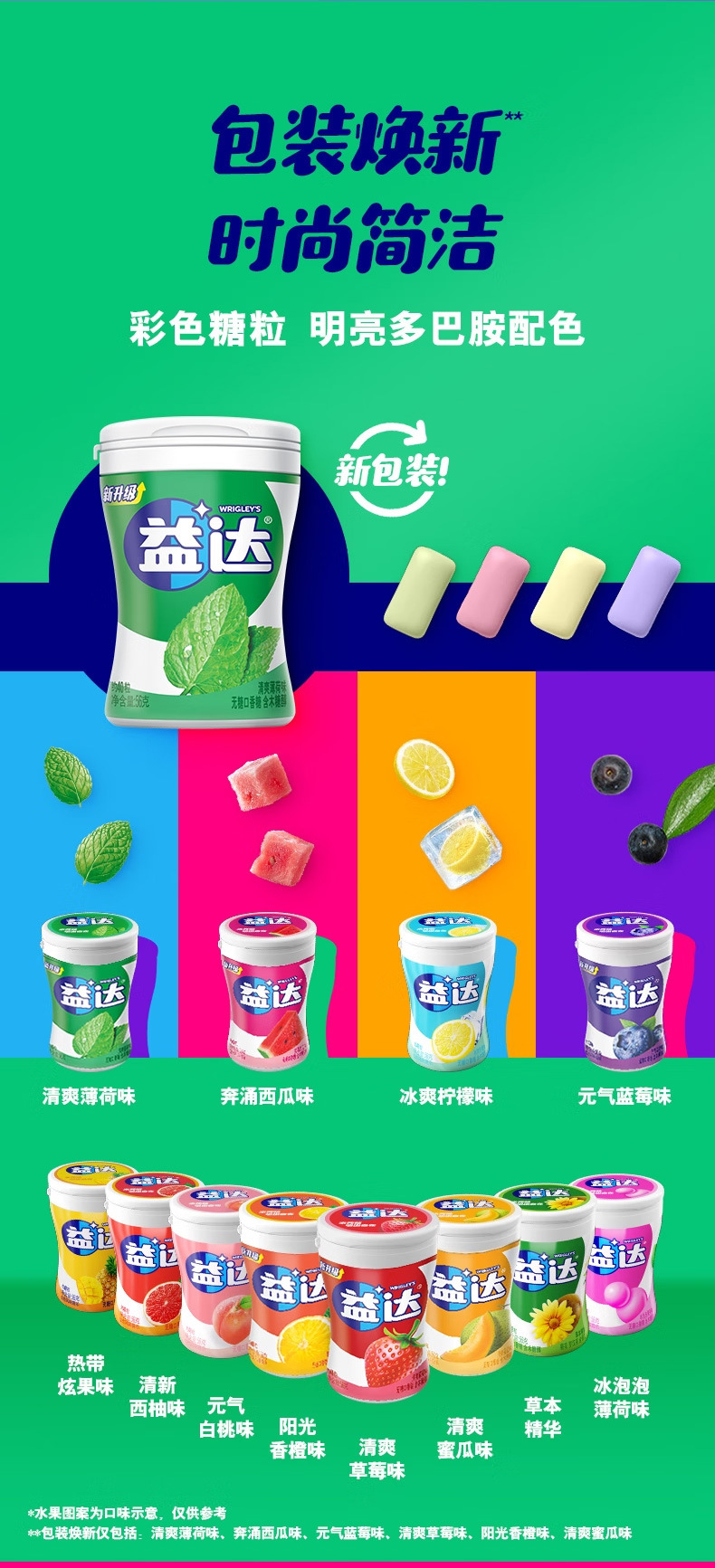 包装规格 益达木糖醇56g【奔涌西瓜味】40粒装(单瓶),益达40粒装【冰泡泡薄荷味】56g(单瓶),益达40粒装【清爽草莓味】56g(单瓶),益达木糖醇56g【清爽蜜瓜味】40粒装(单瓶),益达40粒装【清爽薄荷味】56g(单瓶),益达40粒装【冰爽柠檬味】56g(单瓶),益达40粒装【阳光香橙味】56g(单瓶),益达40粒装【元气蓝莓味】56g(单瓶),益达40粒装【元气白桃味】56g(单瓶),益达木糖醇56g【冰川薄荷味】40粒装(单瓶),益达【草本精华味】56g单瓶(40粒),益达【清新西柚】56g单瓶(40粒),益达【热带炫果味】56g单瓶(40粒)